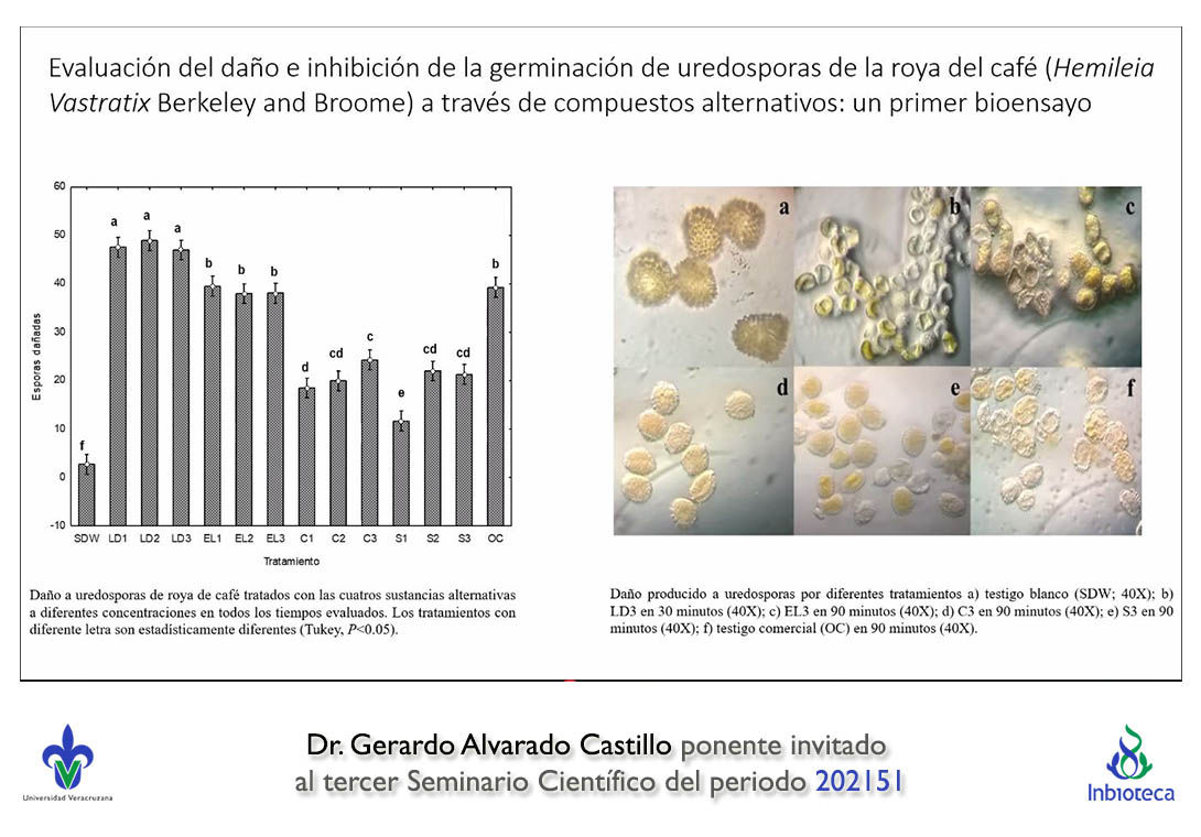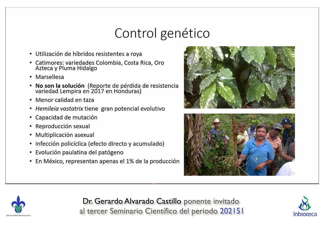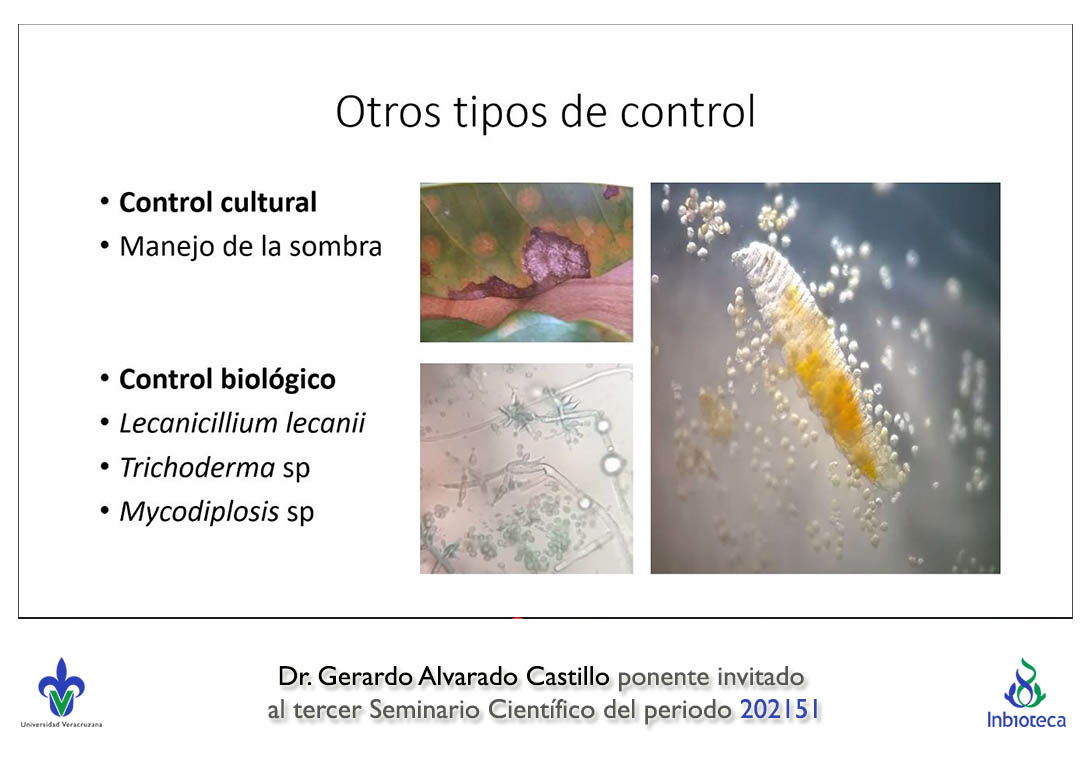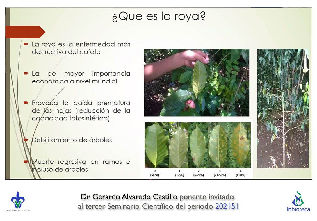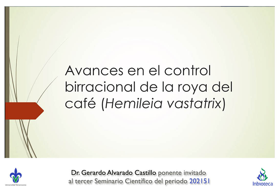 El seminario se realizó con la participación del Dr. Gerardo Alvarado Castillo profesor/investigador de la Facultad de Ciencias Agrícolas Campus Xalapa de la Universidad Veracruzana. La conferencia se tituló "Avances en el control birracional de la roya del café (Hemileia vastatrix)".