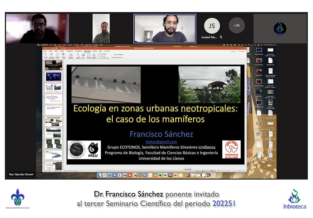 El seminario se desarrolló con la participación del Dr. Francisco sánchez investigador de la Facultad de Ciencias Básicas e Ingeniería de la Universidad de los Llanos, Colombia. La conferencia se tituló: Ecología en Zonas Urbanas Neotropicales: el caso de los mamiferos.