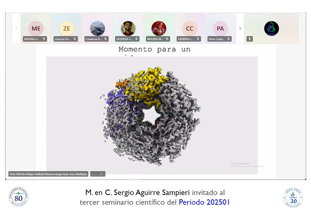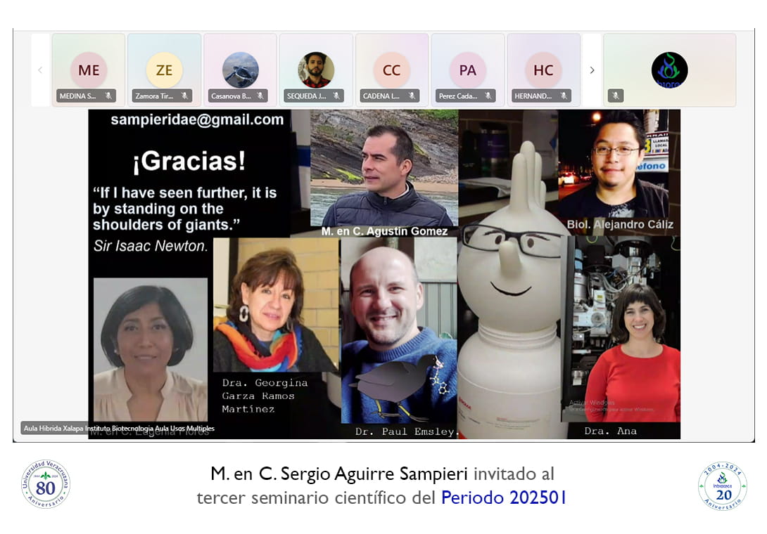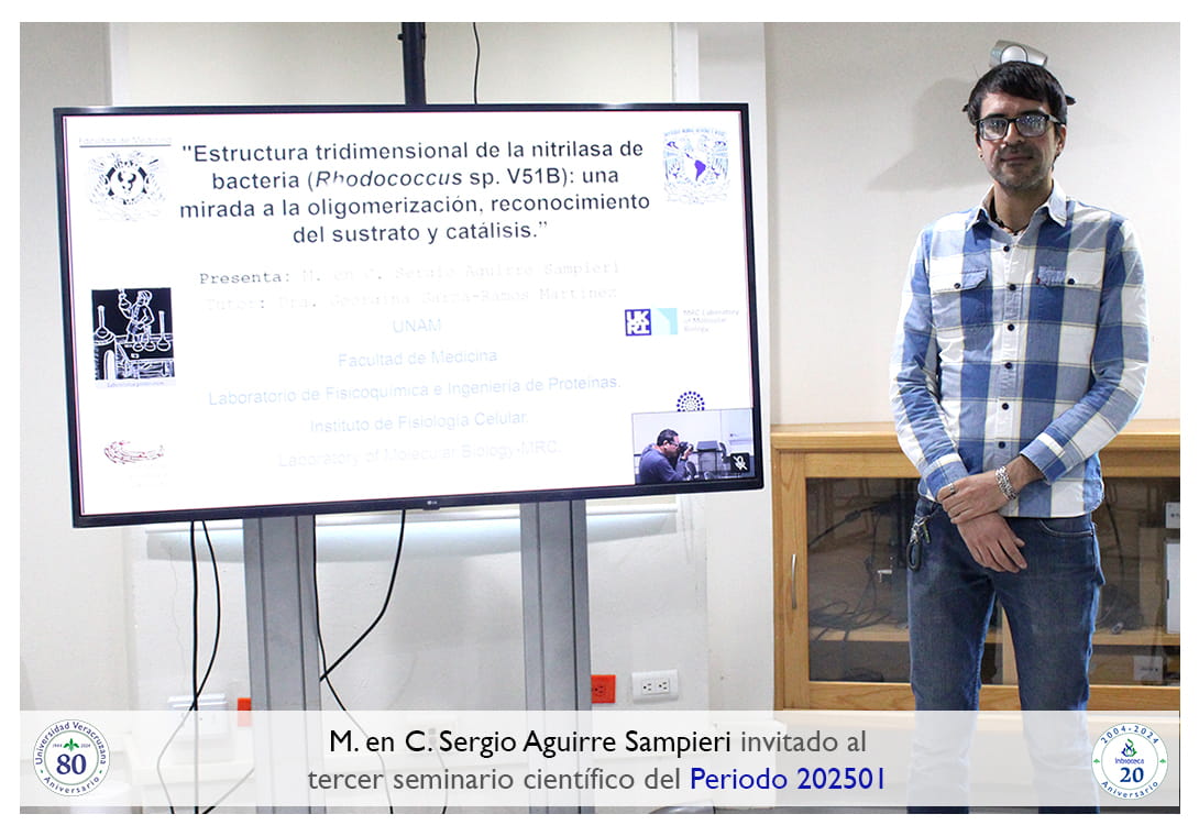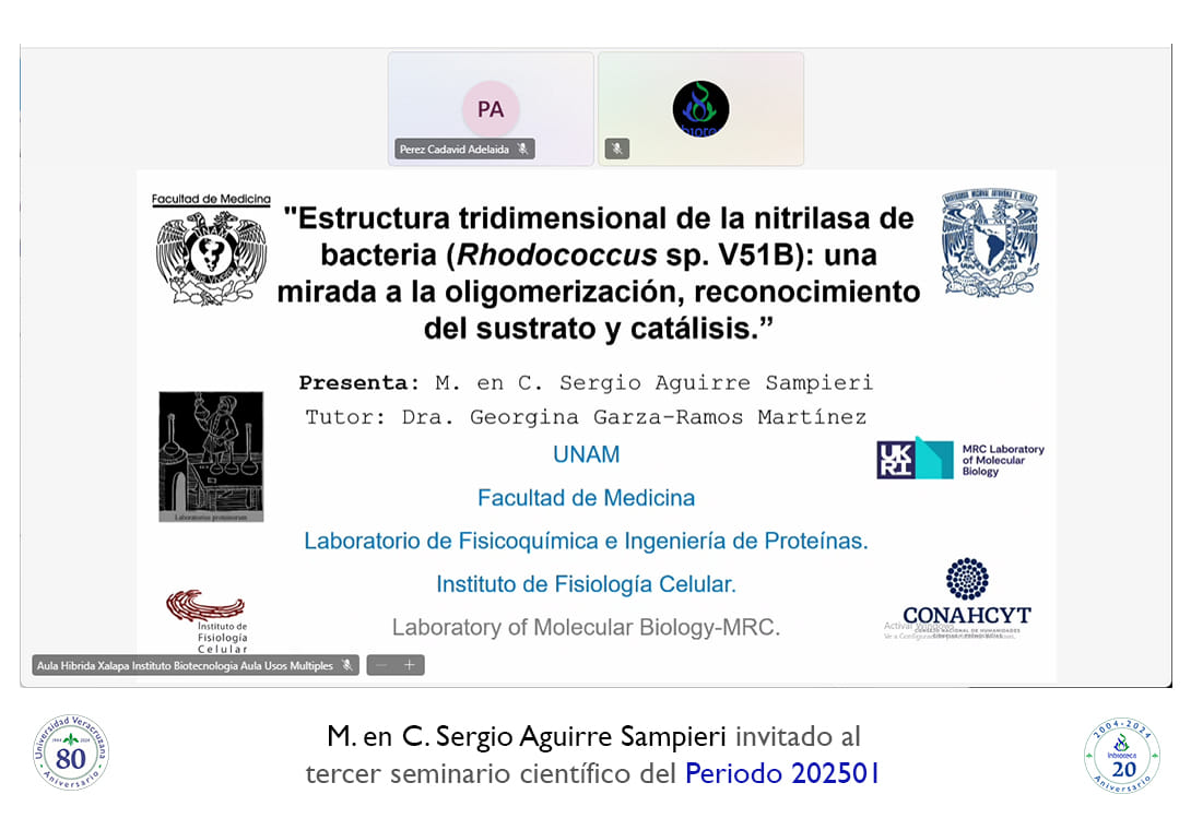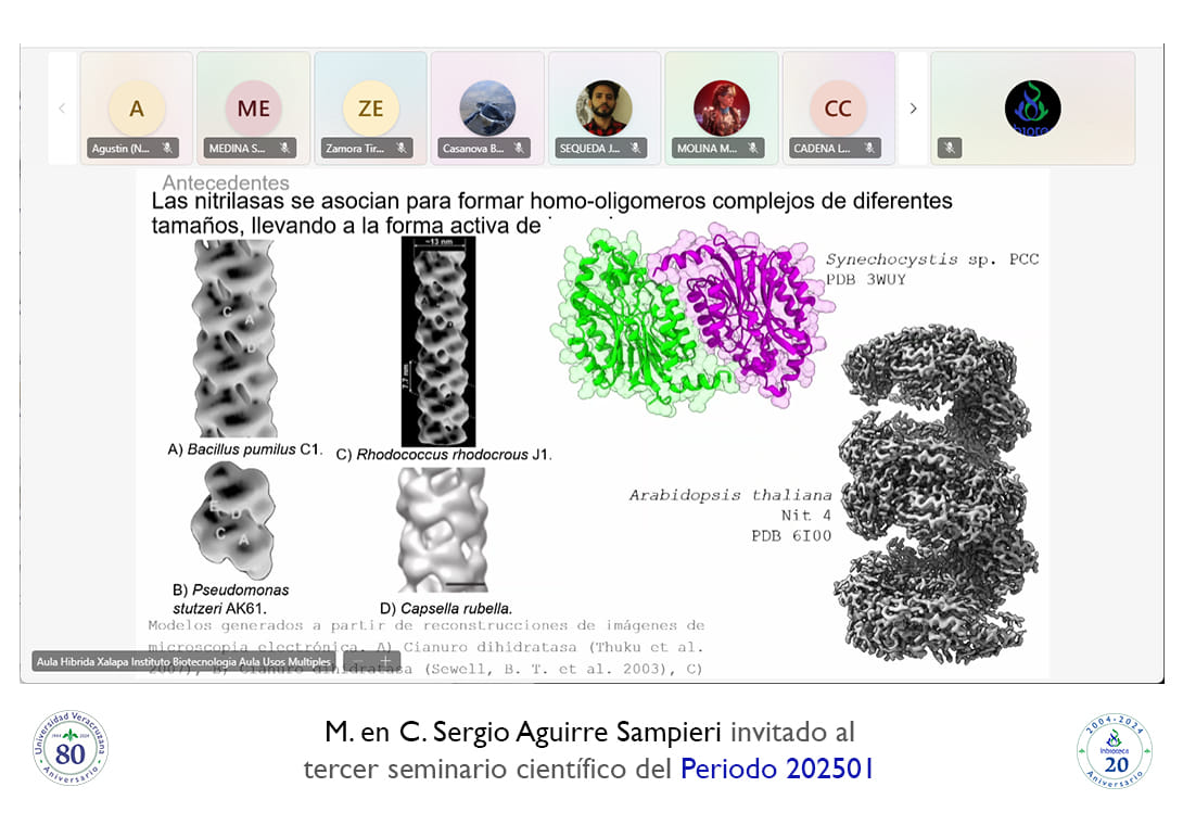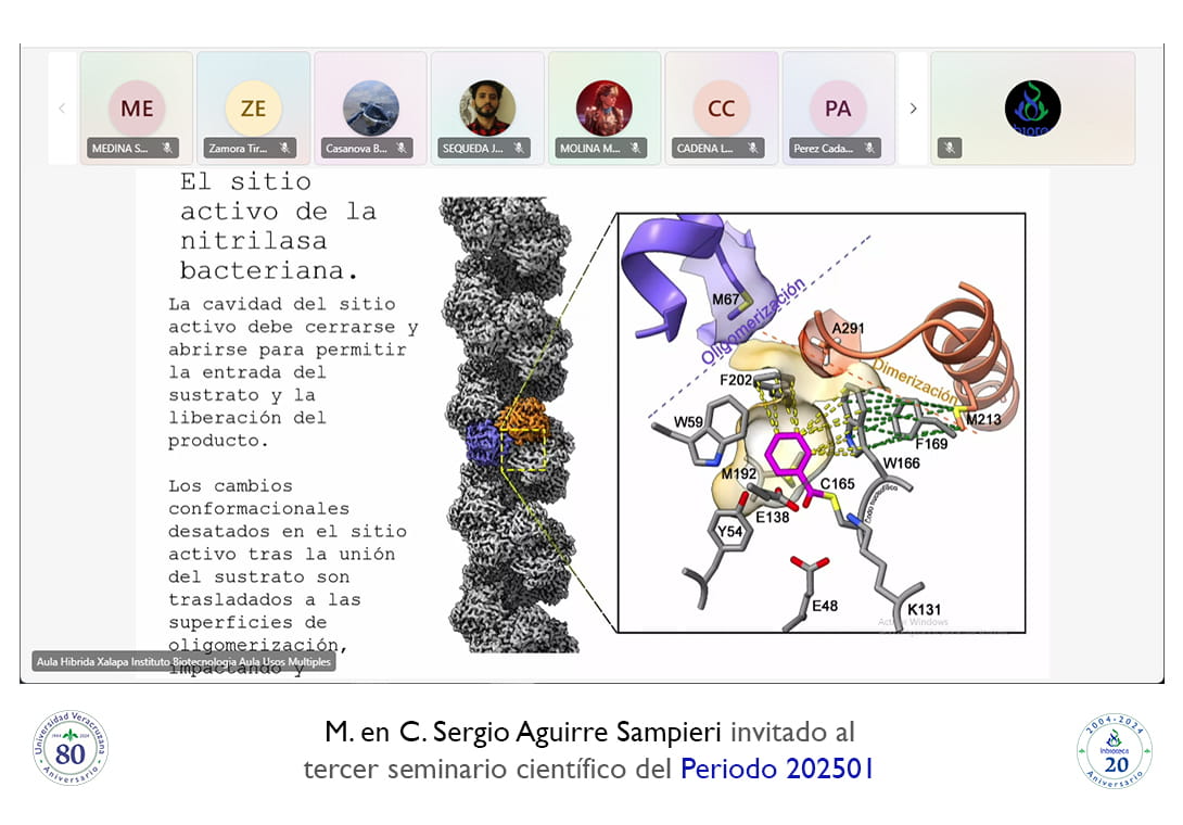 El seminario se desarrolló con la participación del M. en C. Sergio Aguirre Sampieri del Laboratorio de Fisicoquímica e Ingeniería de Proteínas de la Facultad de Medicina de la Universidad Nacional Autónoma de México (UNAM). La conferencia se tituló: Estructura tridimensional de la nitrilasa de bacteria (Rhodococcus sp. V51B): una mirada a la oligomerización, reconocimiento del sustrato y catálisis.