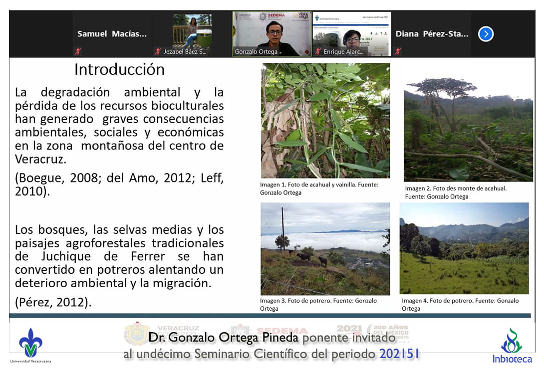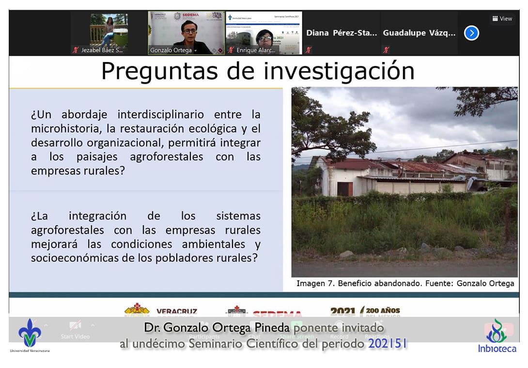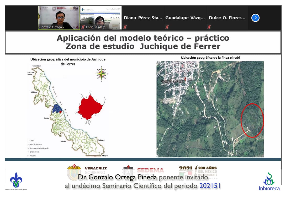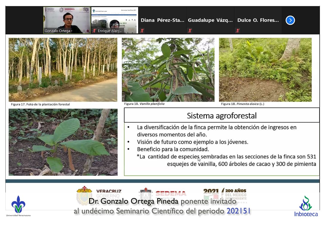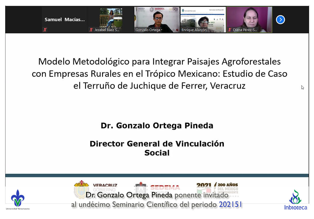 El seminario se desarrolló con la participación del Dr. Gonzalo Ortega Pineda Director General de Vinculacipon Social de la Secretaría de Medio Ambiente del Gobierno de Veracruz. La conferencia se tituló Modelo metodológico para integrar Paisajes Agroforestales con Empresas Rurales en el Trópico Mexicano: Estudio de Caso en el Terruño de Juchique de Ferrer, Veracruz..