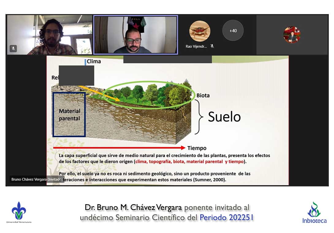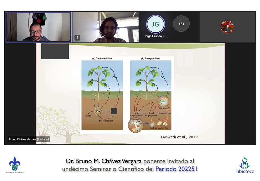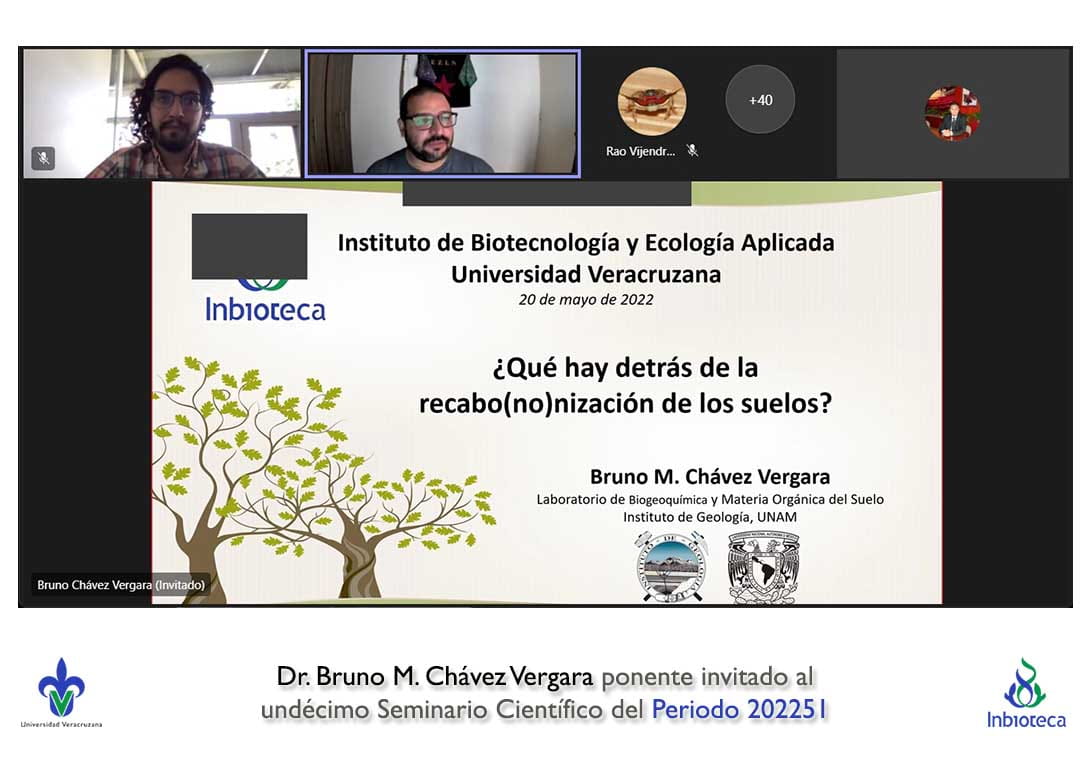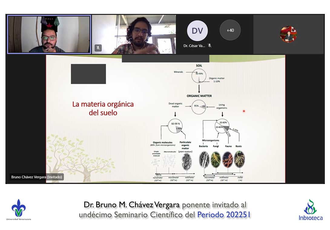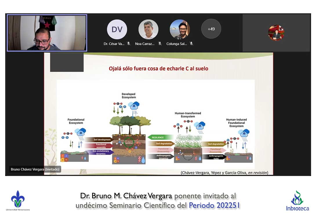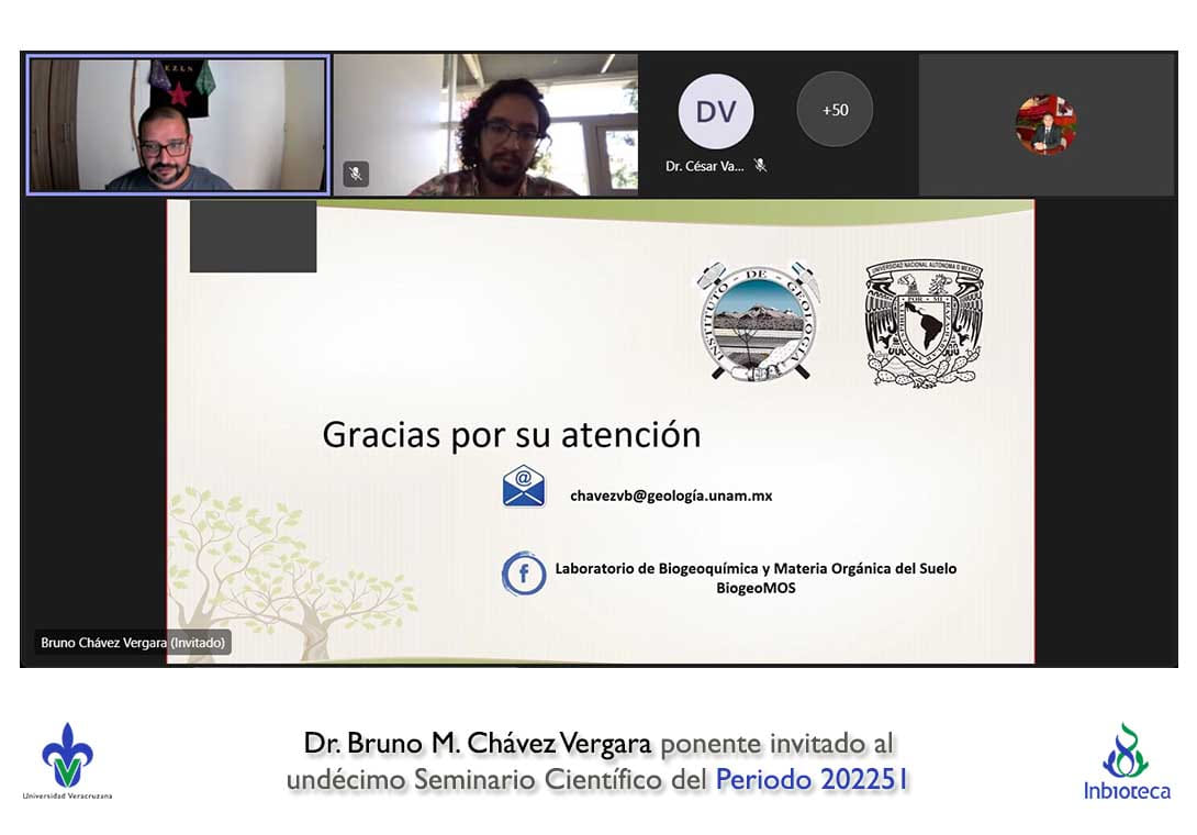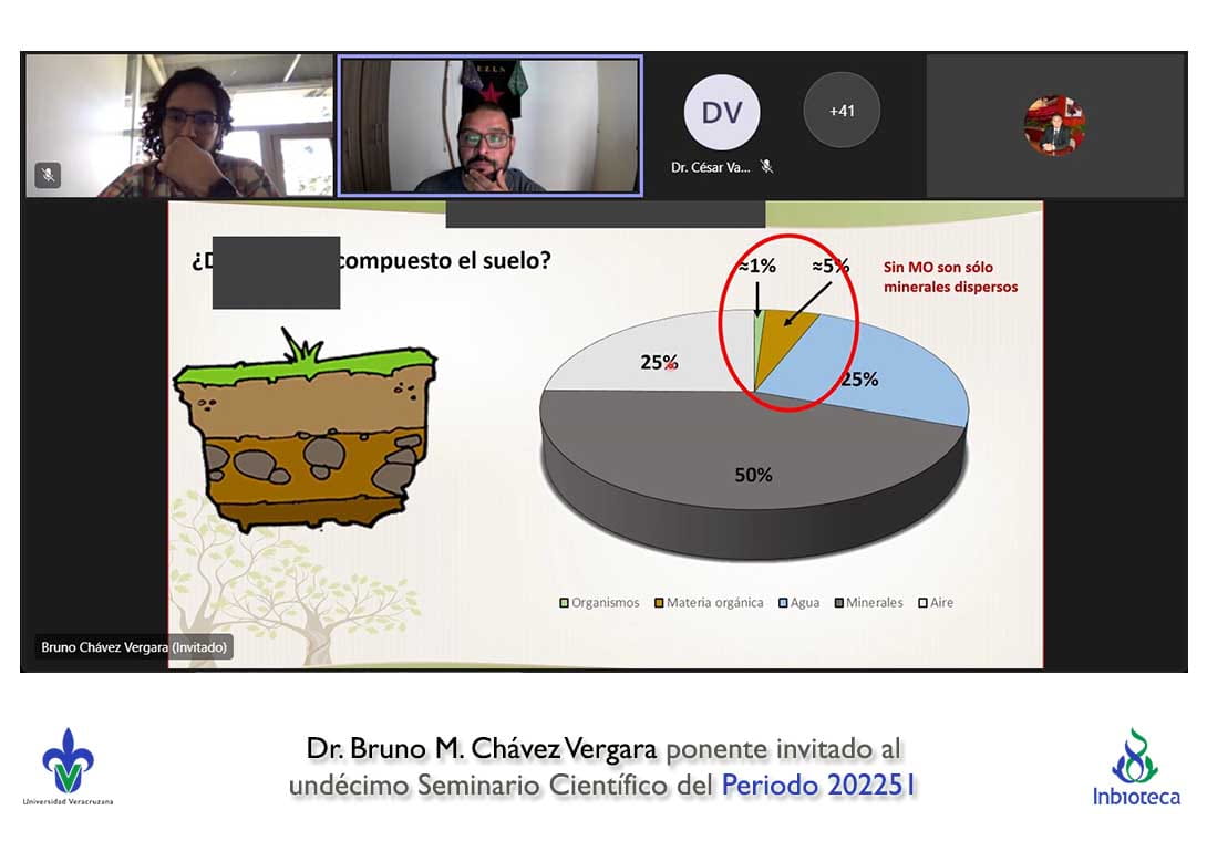 El seminario se desarrolló con la participación del Dr. Bruno Manuel Chávez Vergara Investigador titular del Laboratorio de Biogeoquímica y Materia Orgánica del Suelo del Instituto de Geología de la Universidad Nacional Autónoma de México (UNAM). La conferencia se tituló: ¿Qué hay detrás de la recarbo(no)nización de los suelos?.