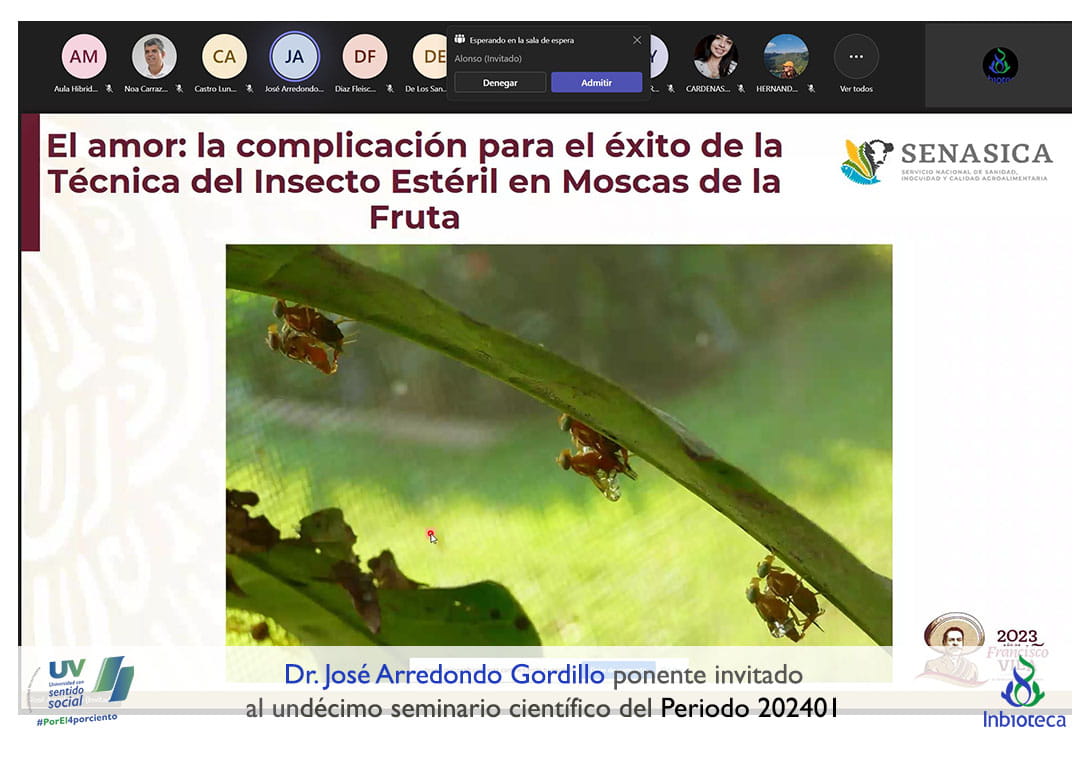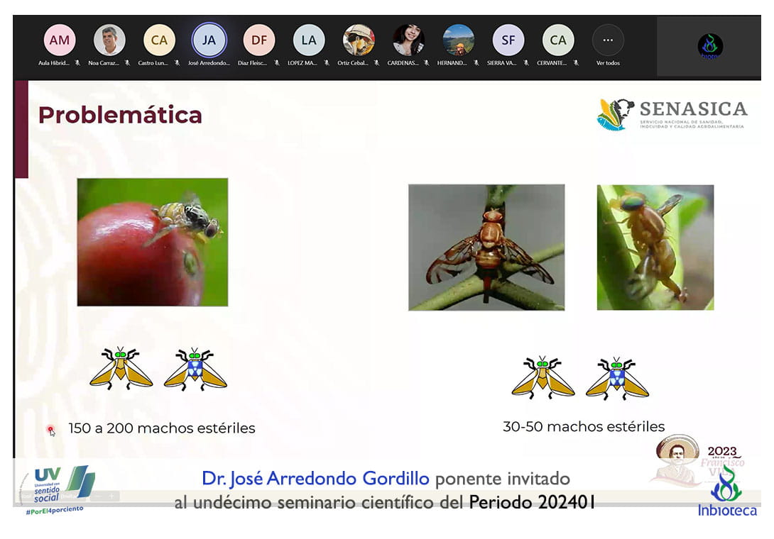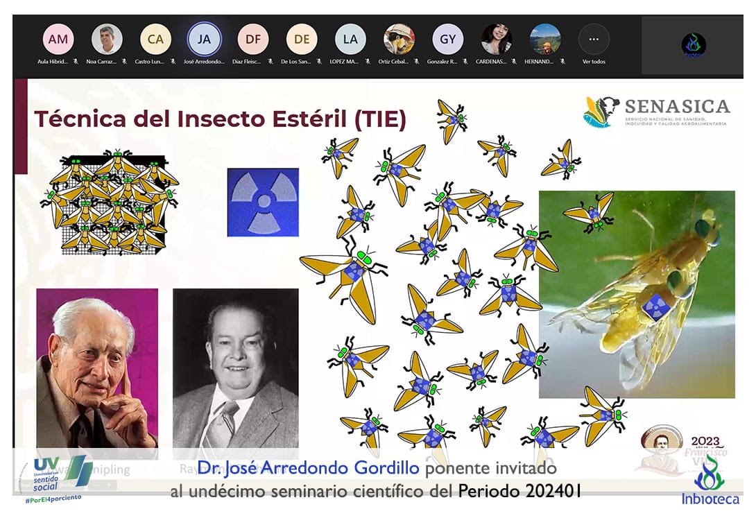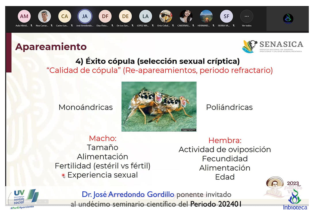 El seminario se desarrolló con la participación del Dr. José Arredondo Gordillo Investigador del Programa Moscamed de la SENASICA – SADER. La conferencia se tituló: El amor: la complicación para el éxito de la técnica del insecto estéril.