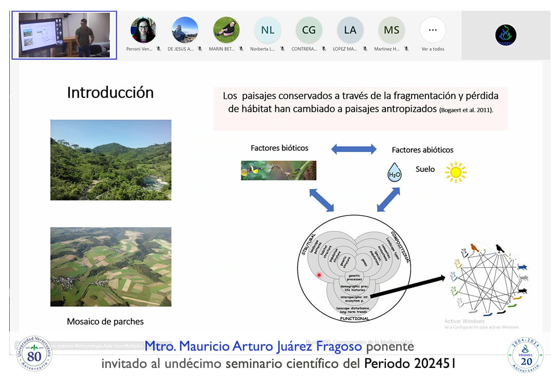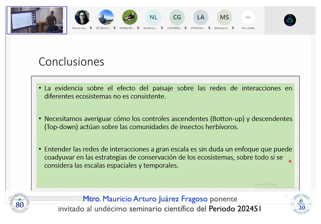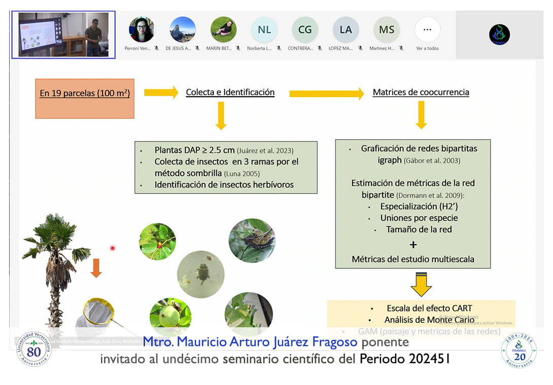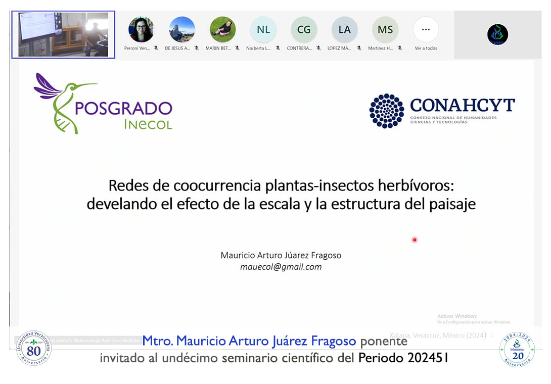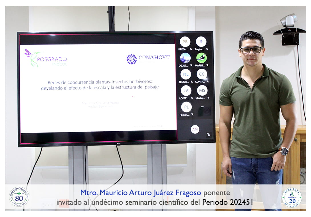 El seminario se desarrolló con la participación del Mtro. Mauricio Arturo Juárez Fragoso estudiante de Doctorado en el Instituto de Ecología A. C. (INECOL). La conferencia se tituló: Redes de coocurrencia plantas-insectos herbívoros: develando el efecto de la escala y la estructura del paisaje.