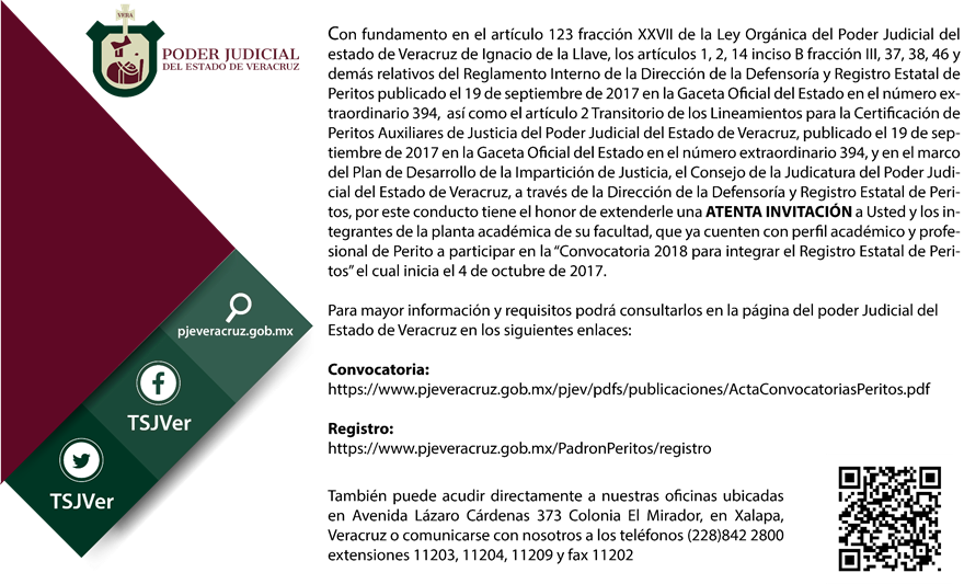 CONVOCATORIA REGISTRO ESTATAL DE PERITOS https://www.pjeveracruz.gob.mx/pjev/pdfs/publicaciones/ActaConvocatoriasPeritos.pdf