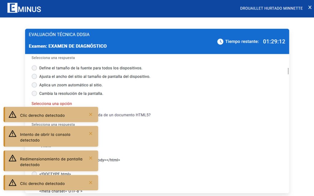 Esta funcionalidad permite al facilitador visualizar un reporte de las incidencias del estudiante. Los estudiantes, al iniciar un examen con monitoreo activado, recibirán notificaciones con un breve mensaje informativo cada vez que se detecte alguna incidencia.