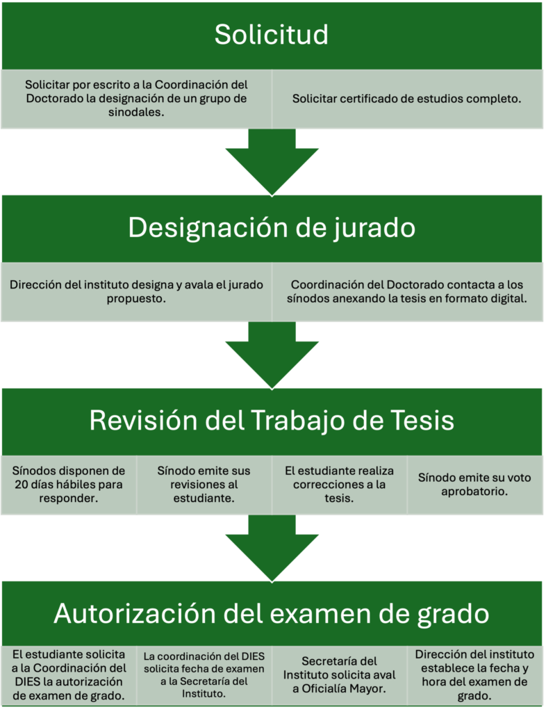 - Solicitar por escrito a la Coordinación del Doctorado la designación de un grupo de sinodales, anexando el voto aprobatorio del director y codirector de la tesis. El grupo de sinodales estará compuesto por cinco sinodales titulares, de los cuales dos pueden ser externos al Instituto de Investigaciones y Estudios Superiores Económicos y Sociales (IIESES) y dos sinodales suplentes quienes se integrarán al jurado sólo en ausencia de los titulares;