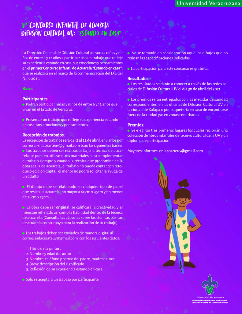 La Dirección General de Difusión Cultural presenta su Primer Concurso Infantil de Acuarela “Estando en Casa” dirigido a niñas y niños de 6 a 12 años para que participen con un trabajo que refleje como ha sido su experiencia, emociones y pensamientos al estar en casa debido a la pandemia mundial por la cual estamos atravesando y como previo a la conmemoración del Día del Niño 2021.