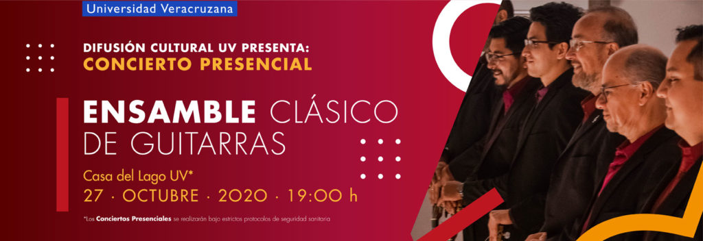 La Dirección General de Difusión Cultural compartiendo con su público la serie de conciertos presenciales, este martes 27 de octubre toca el turno a el Ensamble Clásico de Guitarras en Casa del Lago UV para el deleite de los asistentes, siguiendo los lineamientos para el retorno seguro a las actividades, emitido por la Universidad Veracruzana. La obra seleccionada para este programa es la suite “Yevî-á” para cuatro guitarras. El título está en guaraní y quiere decir alegría, que estará a cargo de cinco intérpretes de la guitarra, Alfredo Sánchez, Jesús Omar Gutiérrez, Luis Enrique González, Leonardo Rivera, Víctor Luis Luna y bajo la dirección de Roberto Aguirre, forman parte de la cartelera de conciertos presenciales del mes de octubre.