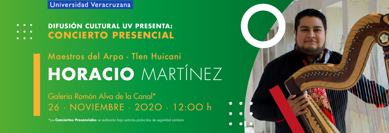 La Dirección General de Difusión Cultural continuando la serie de conciertos presenciales titulado “Maestros del Arpa Tlen Huicani” donde la participación de los integrantes de este grupo artístico será de forma individual, este jueves 26 con un programa de Arpa Instrumental se presenta Horacio Martínez.