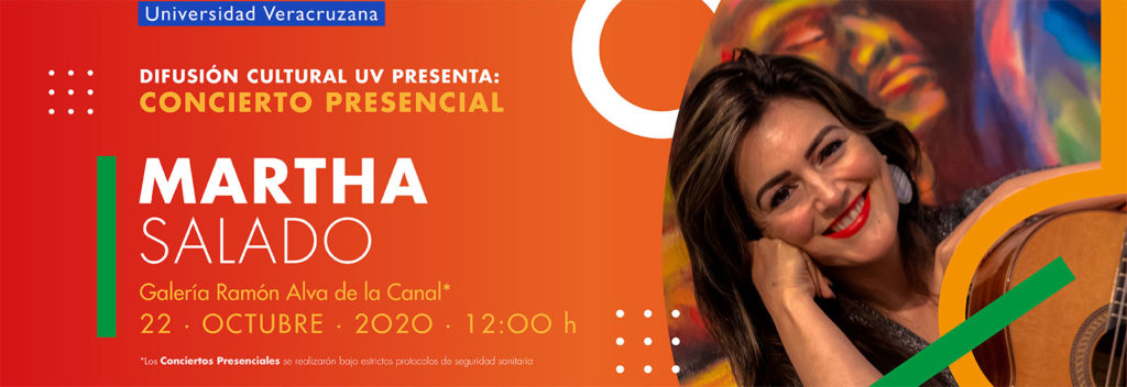 No te pierdas el próximo 22 de octubre en punto de las 12:00 horas a Martha Salado en la Galería Ramón Alva de la Canal, comparte la música y la alegría del Talento UV a cargo de esta interprete de la guitarra que Difusión Cultural UV trae para ti, y no olvides continuar cerca de los grupos artísticos desde las páginas de Facebook, Twitter, YouTube para conocer las medidas necesarias para el acceso a los conciertos presenciales y visita la plataforma DGDC MUSICA en donde encontraras más contenido.