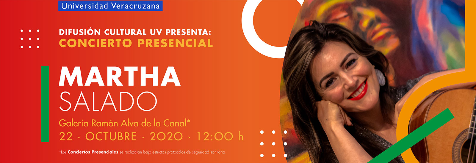 La Dirección General de Difusión Cultural continuando con la serie de conciertos presenciales, trae el próximo 22 de octubre en concierto presencial a Martha Salado en la Galería Ramón Alva de la Canal.
