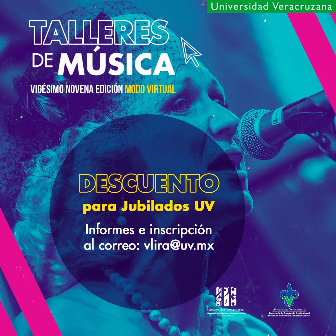 La Dirección General de Difusión Cultural, además de promover el arte y la cultura generado por la Universidad Veracruzana, pone al alcance de la Comunidad UV y público en general su oferta educativa, que incluye talleres de música, cursos y diplomados. A partir de esta 29° edición los Talleres de Música ofrecen lugares con descuento especial para los Jubilados UV.