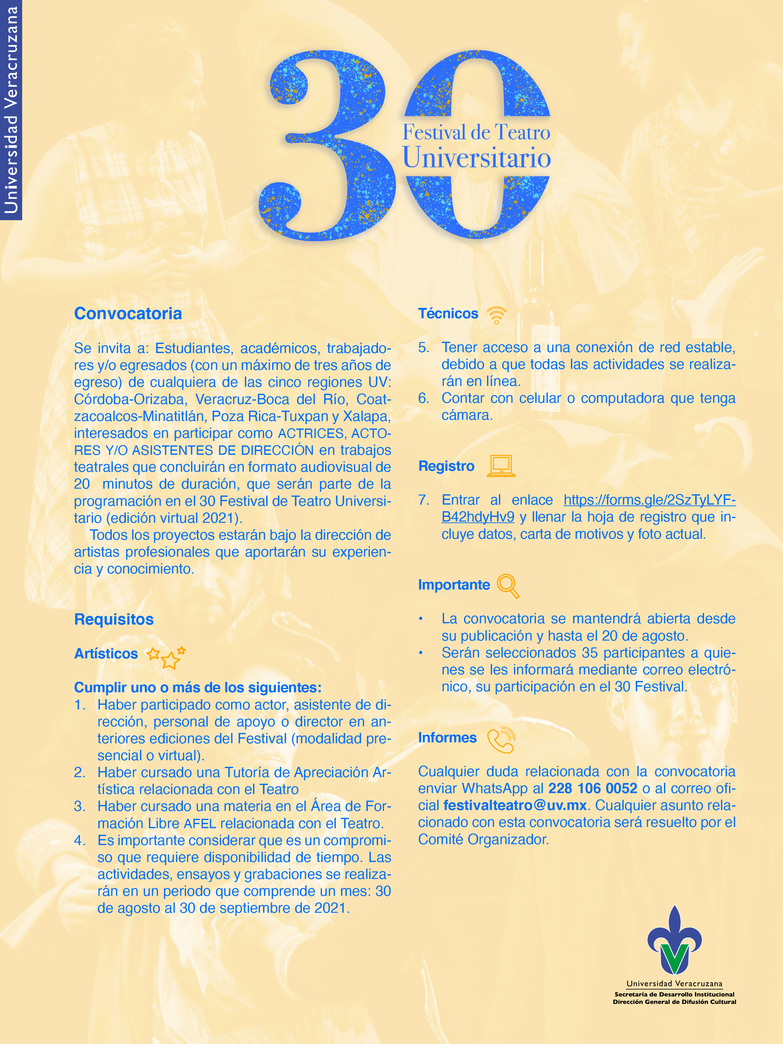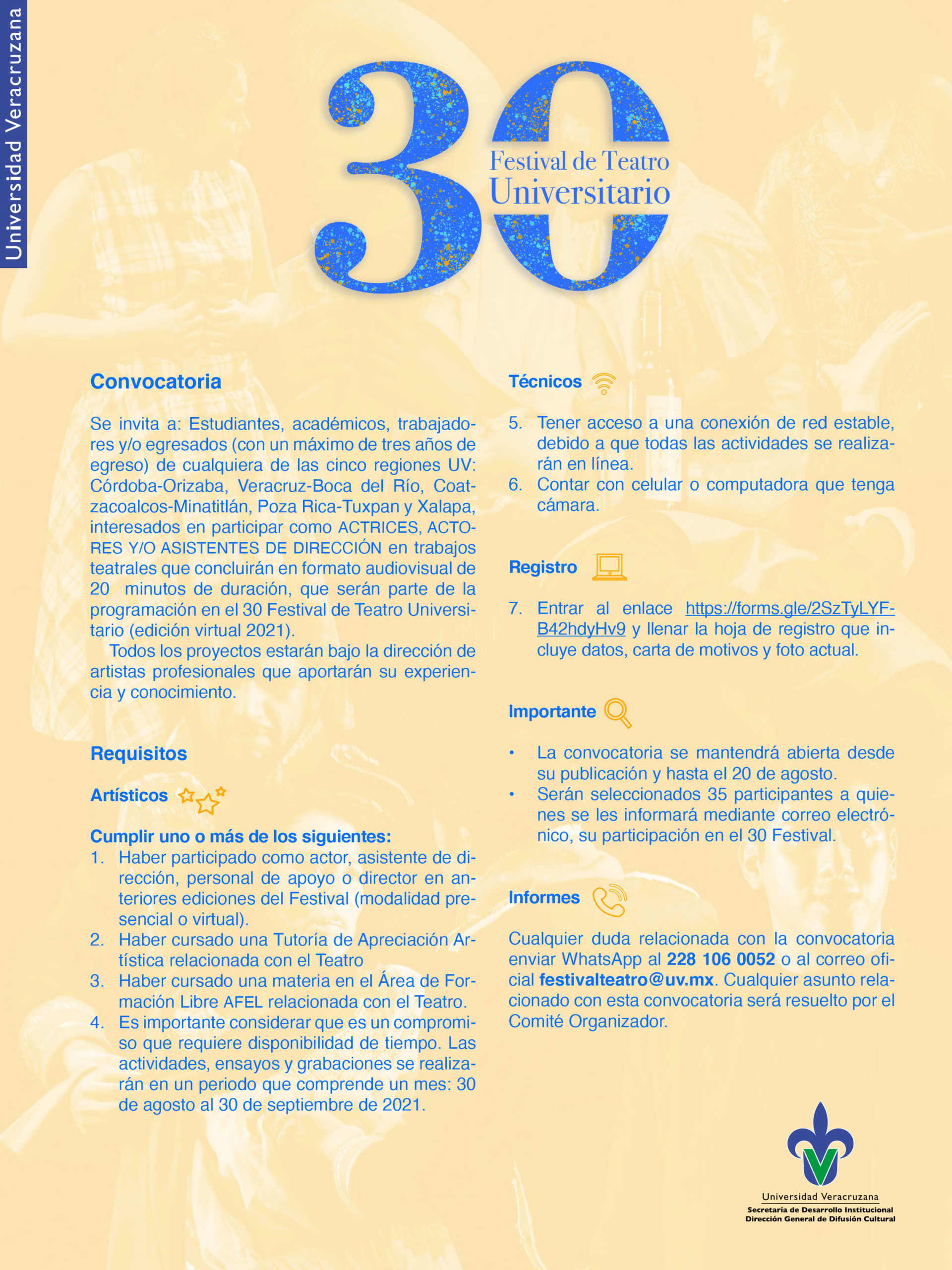 Para más información del festival y consultar la convocatoria pueden ingresar a la página de Facebook: Festival de Teatro Universitario UV – Oficial o al portal de Difusión Cultural UV https://www.uv.mx/difusioncultural/