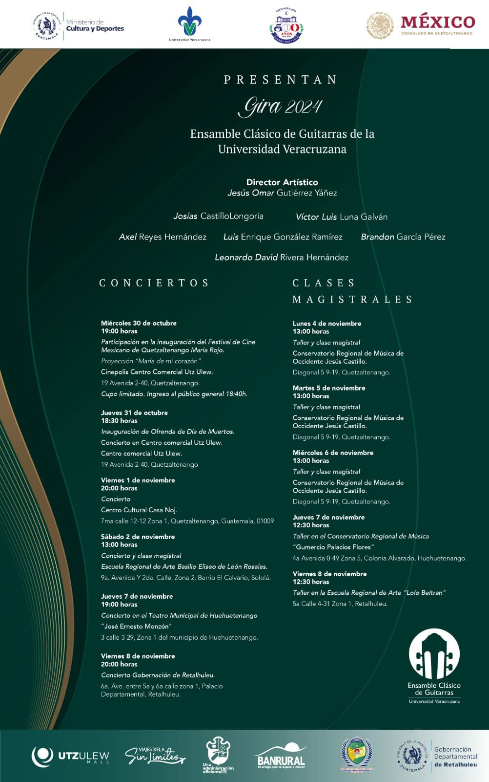 En conmemoración del 500 aniversario de la fundación de la Ciudad de Quetzaltenango, Guatemala, el Ensamble Clásico de Guitarras se enorgullece de participar en una gira de conciertos y talleres que recorrerán diversos espacios de la ciudad y sus alrededores. Esta participación busca enriquecer el panorama cultural de Quetzaltenango y estrechar los lazos de colaboración y amistad entre el Consulado de México en Quetzaltenango y la Universidad Veracruzana.