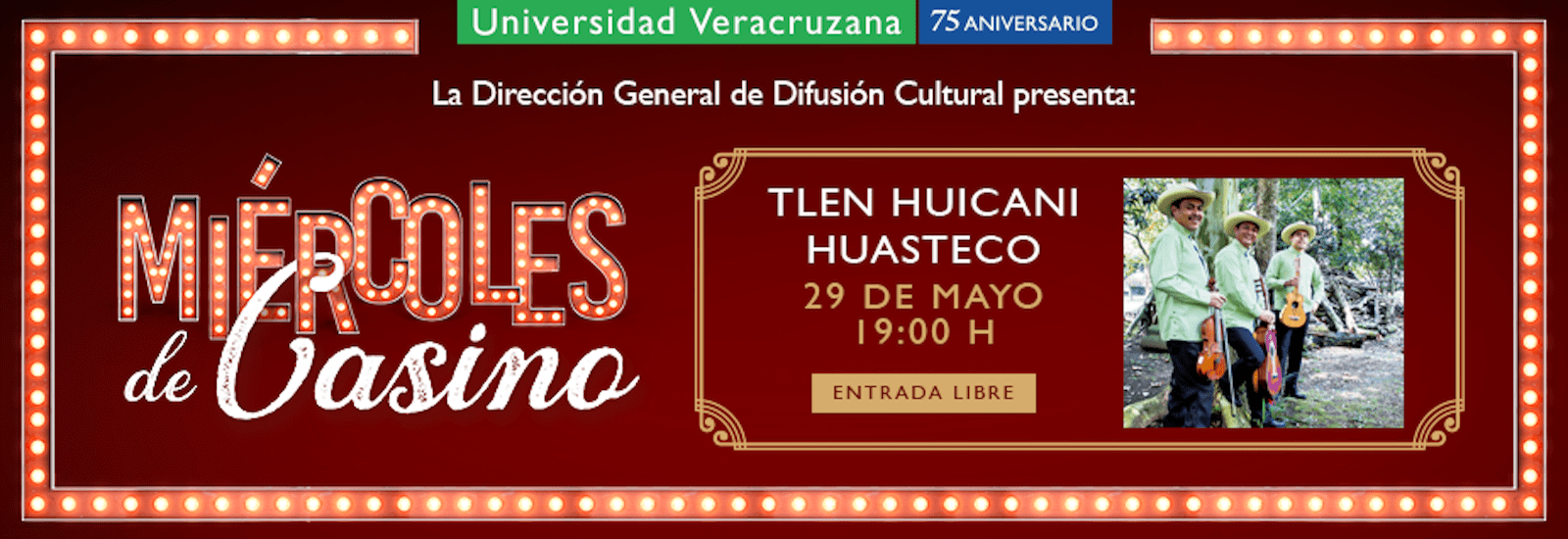 La cartelera artística que ofrece semanalmente la Dirección General de Difusión Cultural de la Universidad Veracruzana (UV), en el Casino Jalapeño, presenta este miércoles 29 de mayo a las 19:00 horas un recital con Tlen Huicani Huasteco, con acceso libre para todo público.