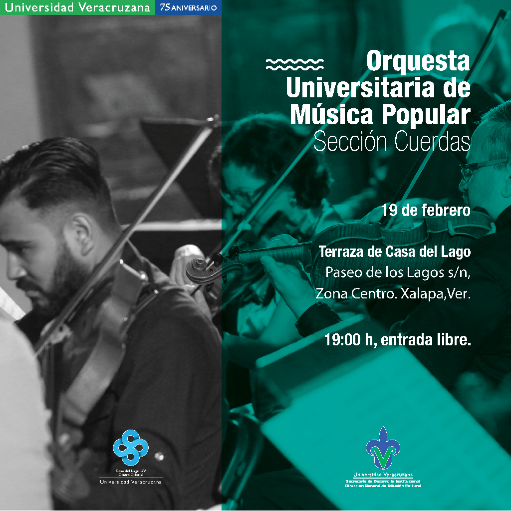 La programación artística que la Dirección General de Difusión Cultural de la Universidad Veracruzana en la terraza de la Casa del Lago UV, presenta este martes 19 de febrero a partir de las 19:00 horas un recital de la sección Cuerdas de la Orquesta Universitaria de Música Popular (OUMP).