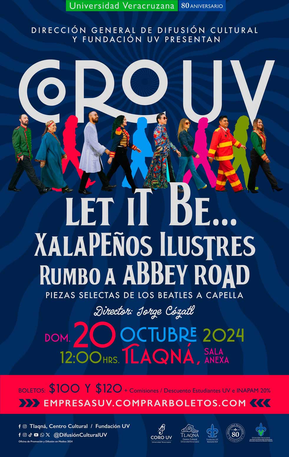El domingo 20 será un día especial con el Coro UV a las 12:00 hrs presentando Let it be… Xalapeños Ilustres rumbo a Abbey Road en la Sala Anexa, Tlaqná. Este concierto promete ser una experiencia única que revive los clásicos a capella de Los Beatles que han marcado la historia de la música. Los boletos tienen un costo de $100.00 y $120.00 más comisiones, se pueden adquirir en https://empresasuv.comprarboletos.com/