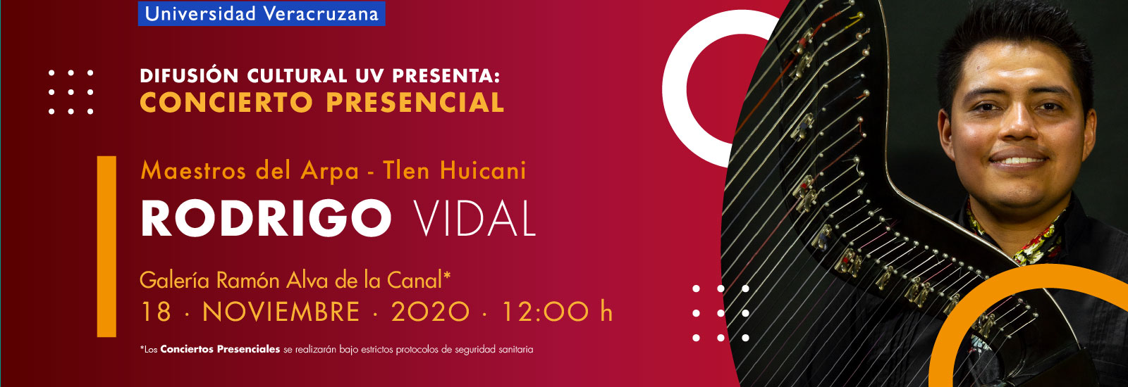 La Dirección General de Difusión Cultural trae a escena una serie de conciertos presenciales titulado “Maestros del Arpa Tlen Huicani” donde la participación de los integrantes de este grupo artístico será de forma individual, este miércoles 18 con un programa de Arpa Instrumental se presenta Rodrigo Vidal.
