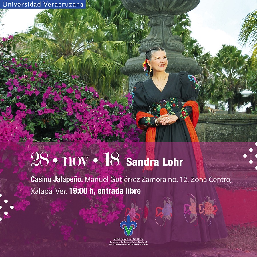 La programación semanal que ofrece en el Casino Jalapeño la Dirección General de Difusión Cultural de la Universidad Veracruzana (UV), contempla este miércoles 28 de noviembre a partir de las 19:00 horas un recital de canciones de Latinoamérica en la voz de Sandra Lohr, con Pepe González en el teclado y José Luis Arauz en el arpa.