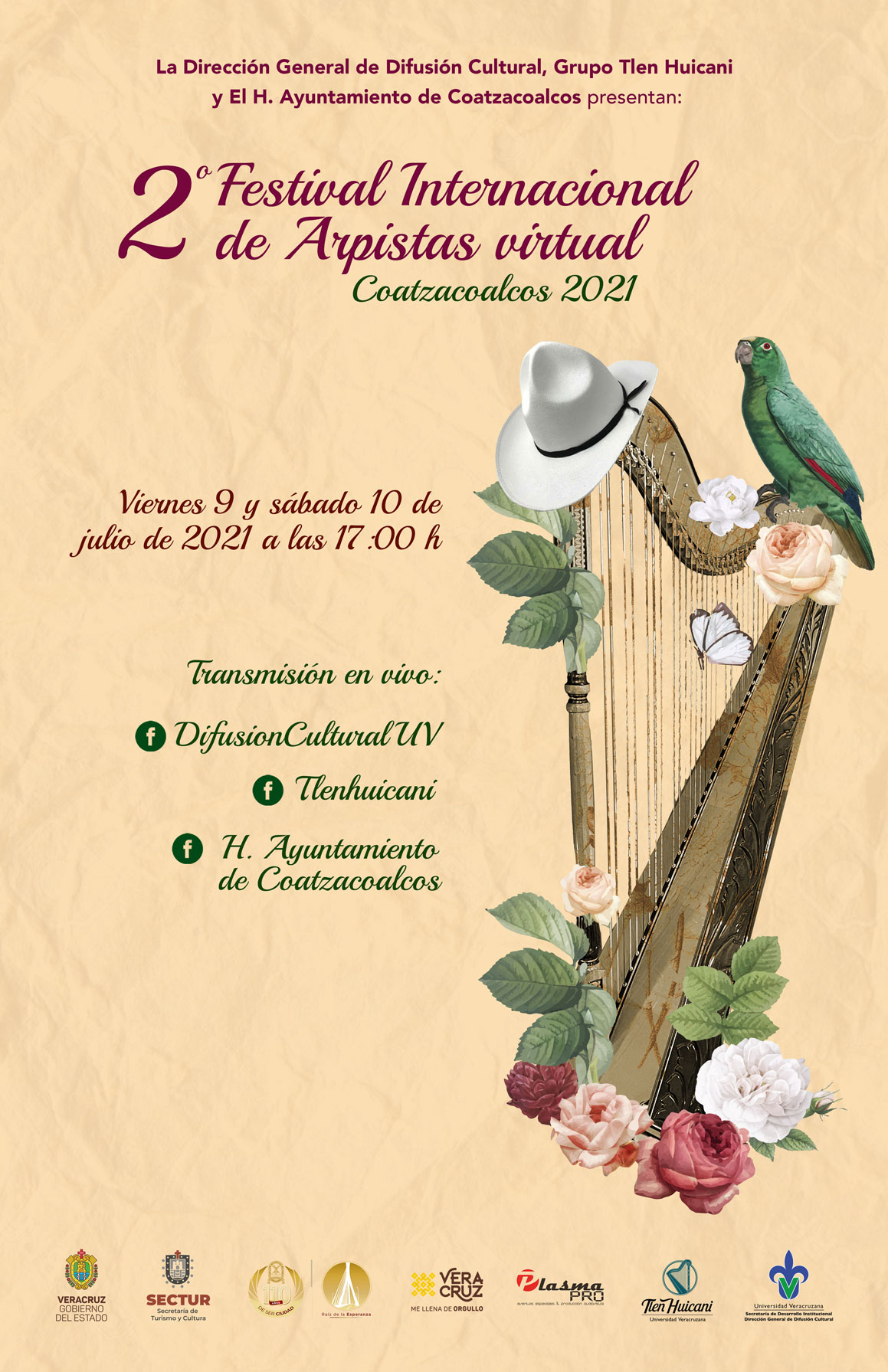 La Dirección General de Difusión Cultural de la Universidad Veracruzana y el grupo Tlen Huicani en colaboración con el H. Ayuntamiento de Coatzacoalcos, presentan el 2° Festival Internacional de Arpistas virtual Coatzacoalcos 2021, que será transmitido en vivo los días viernes 9 y sábado 10 de julio en punto de las 17:00 hrs. (horario de México) a través del Facebook de Difusión Cultural UV, Tlen Huicani y del H. Ayuntamiento de Coatzacoalcos.
