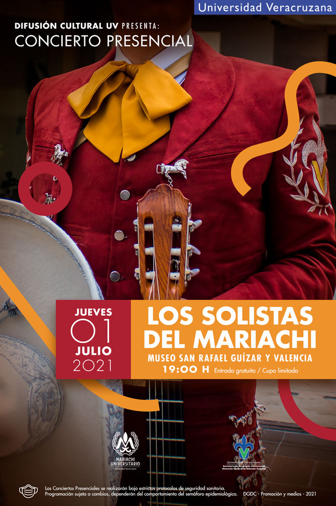 Iniciamos con la participación del ensamble de Solistas del Mariachi Universitario, el jueves 1 de julio, se presentan en el Museo San Rafael Guízar y Valencia ubicado en la calle Benito Juárez No. 70, Col. Centro, en punto de las 19:00 horas. Los instrumentos que destacarán en esta presentación son el arpa, la trompeta y el violín, algunos de los temas que se podrán disfrutar en esta presentación son La Sandunga, Estrellita, Dios nunca muere, La fuente, Misty, entre otros.