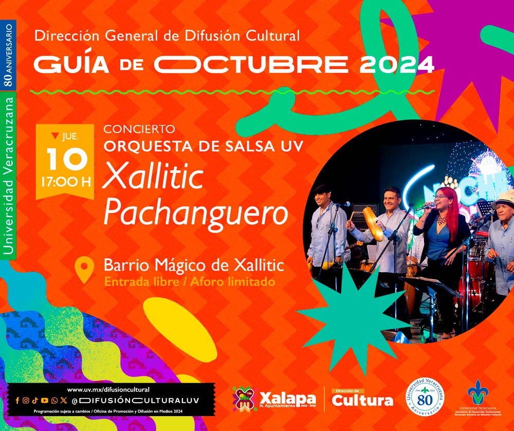 La Dirección General de Difusión Cultural invita a la comunidad xalapeña a disfrutar de un concierto inolvidable en compañía de la Orquesta de Salsa UV titulado “Xallitic Pachanguero”, que se llevará a cabo el jueves 10 de octubre a las 17:00 horas en el emblemático Barrio Mágico Xallitic. Este evento será una celebración en compañía de los ritmos y melodías de la salsa, donde podrán disfrutar de una tarde llena de música y baile.