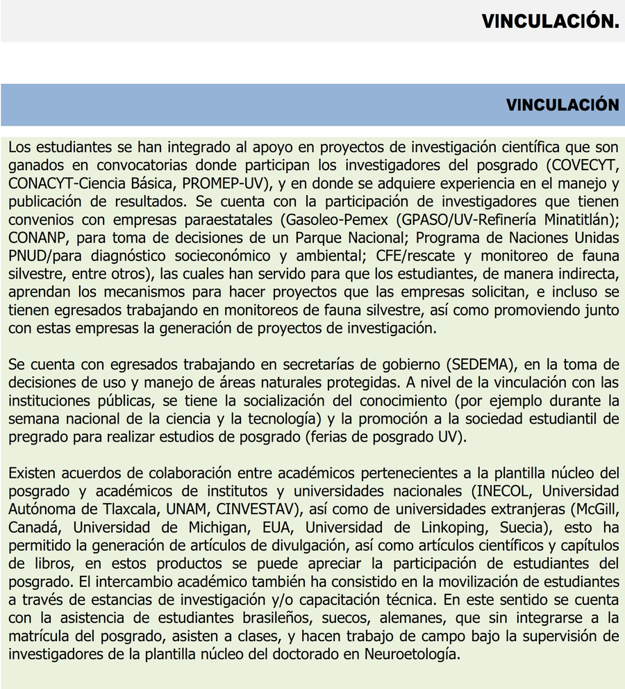 La plantilla de académicos que participan en el programa de Neuroetología, mantienen colaboración con diversas instituciones nacionales e internacionales, lo que permite a los estudiantes realizar cursos, talleres y estancias de investigación durante su formación académica.
