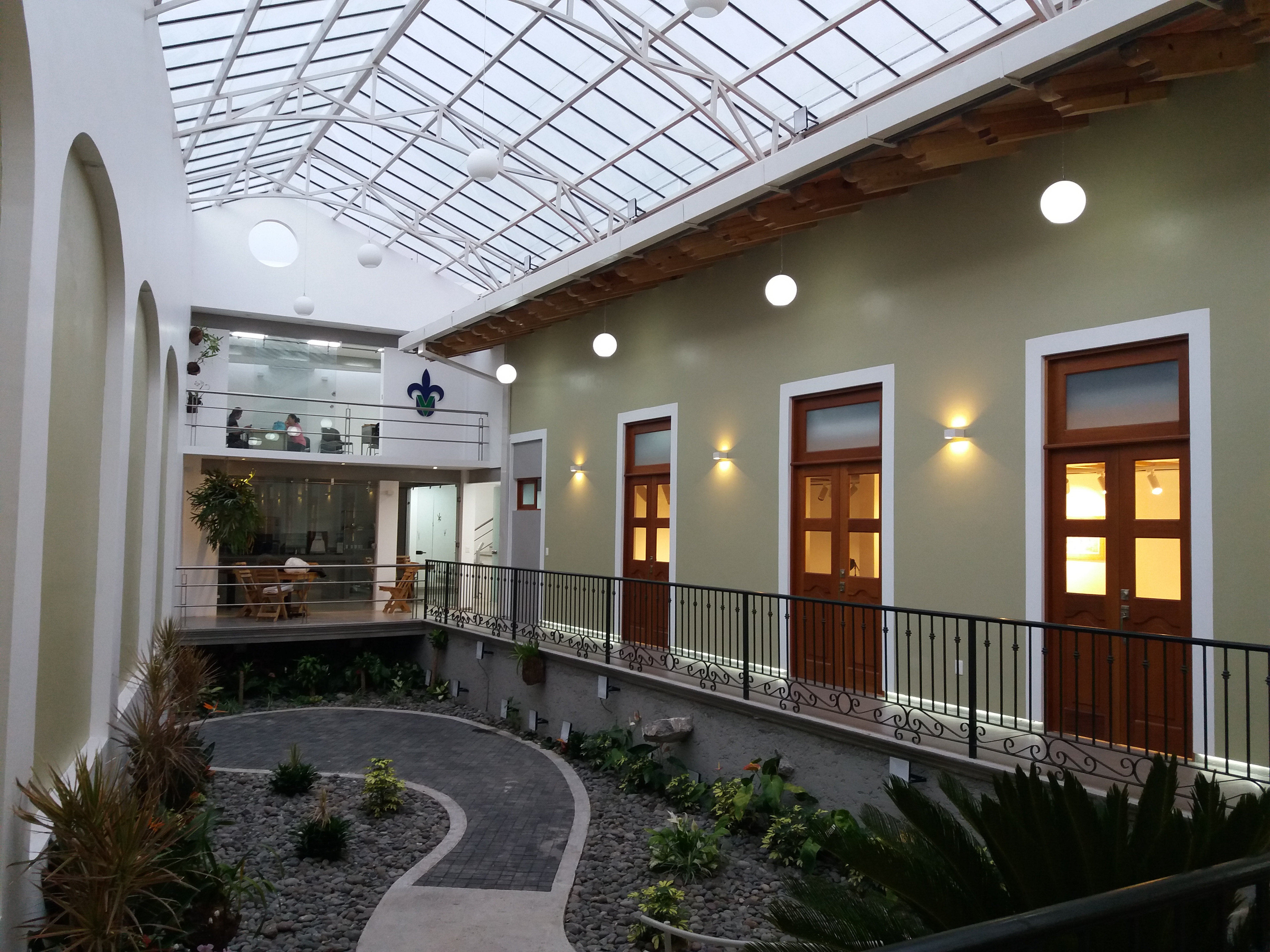 Al fondo del terreno se construyó un espacio de dos niveles para oficinas y cafetería, con un carácter contemporáneo que hace contraste delimitando la edificación original con la construcción nueva, pero al mismo tiempo integrándose al conjunto arquitectónico.