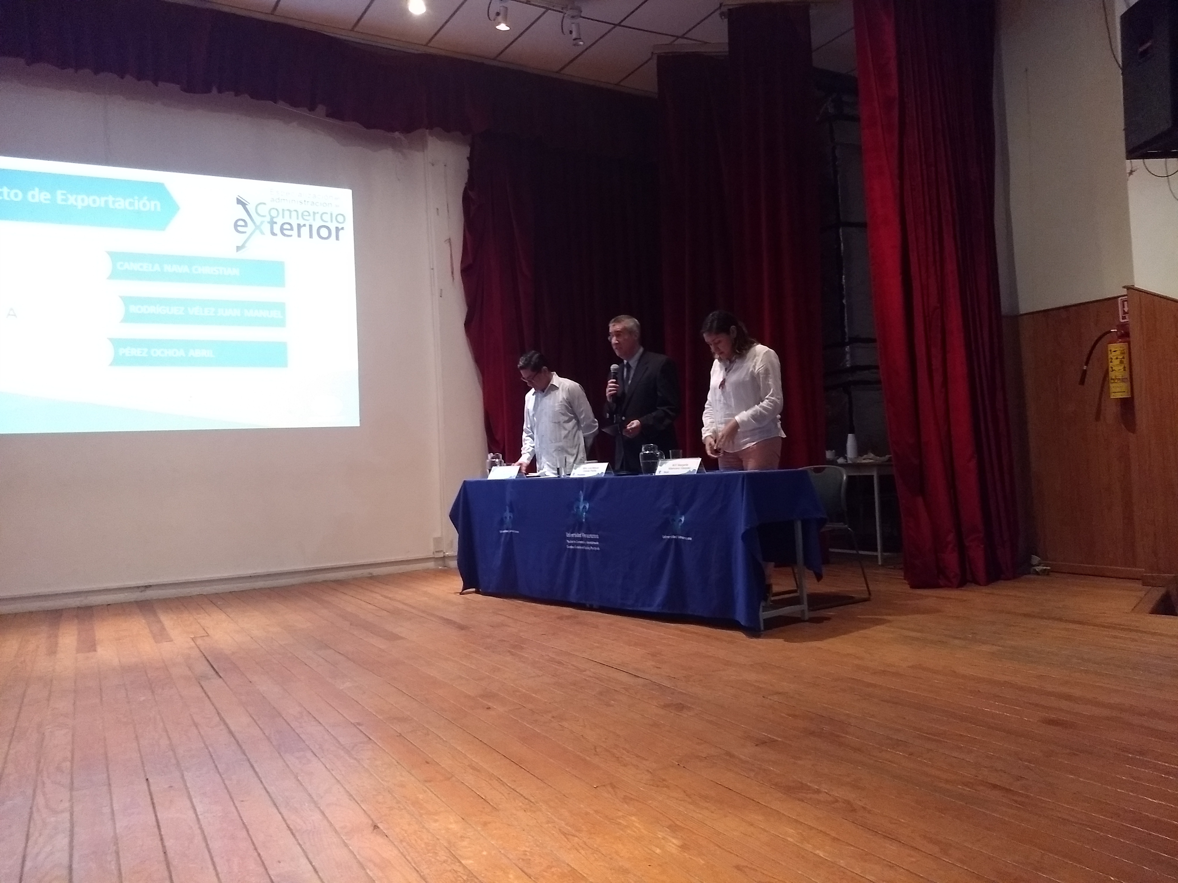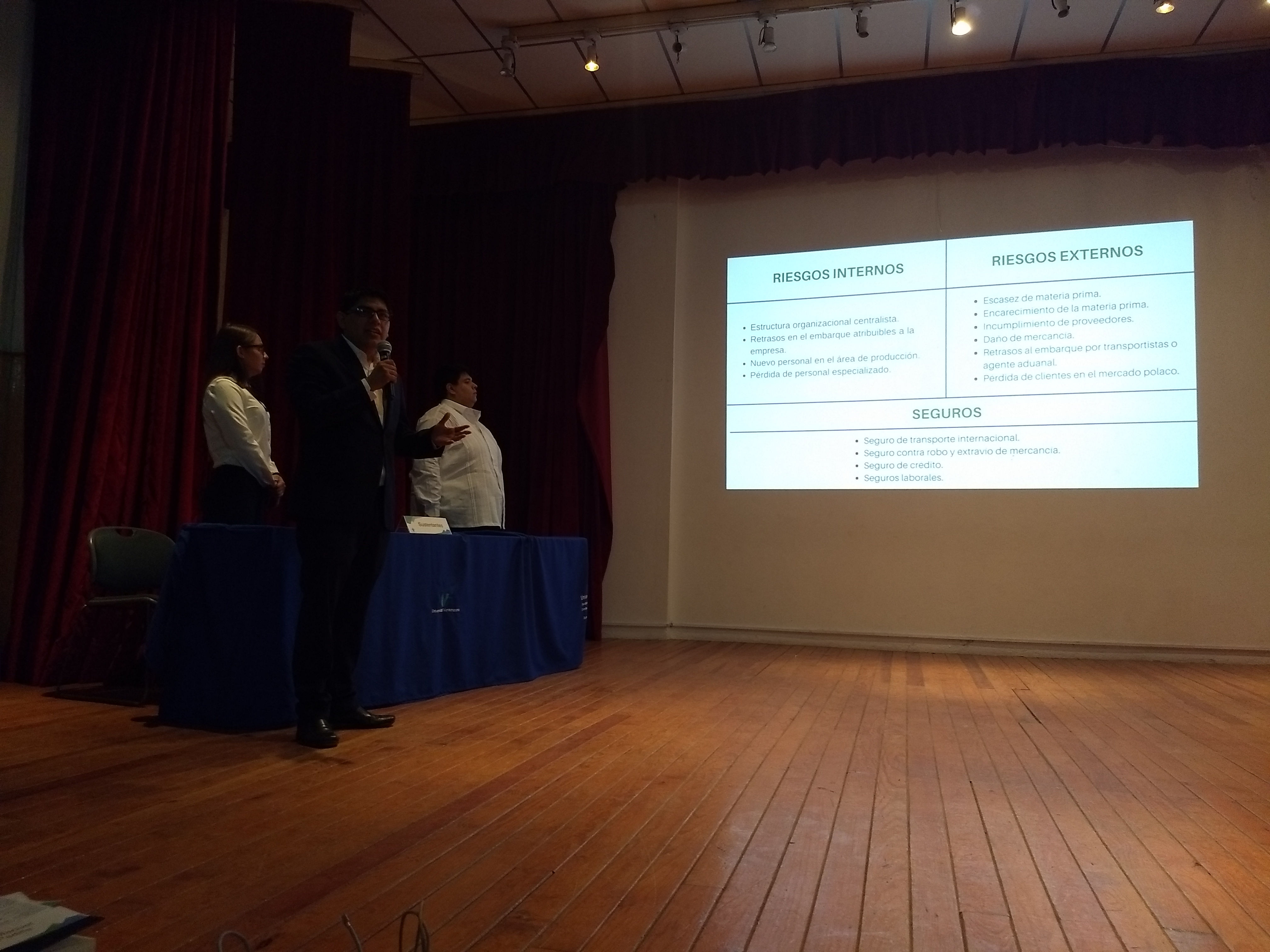 Los alumnos Cancela Nava Christian, Pérez Ochoa Abril y Rodríguez Velez Juan Manuel realizaron la presentación de su Proyecto de Exportación “Cerveza Artesanal Niebla a Polonia”, ante los integrantes del jurado Ing. Luis Manuel Cuevas Padilla, Dr. José Vicente Díaz Martínez y M.A.F. Margarita Altamirano Vásquez.