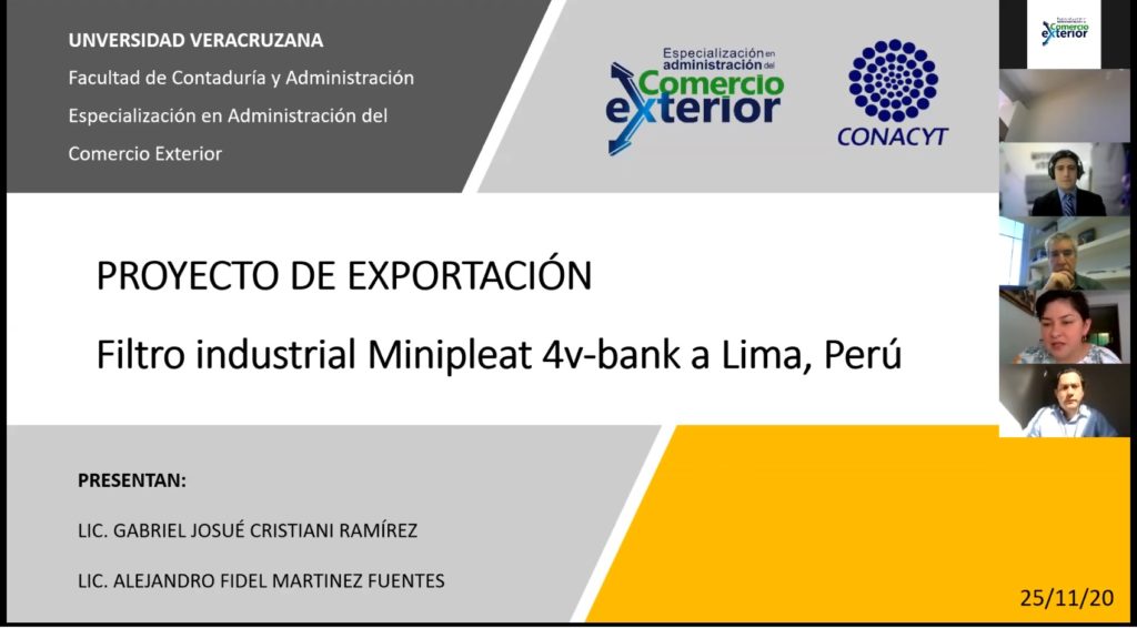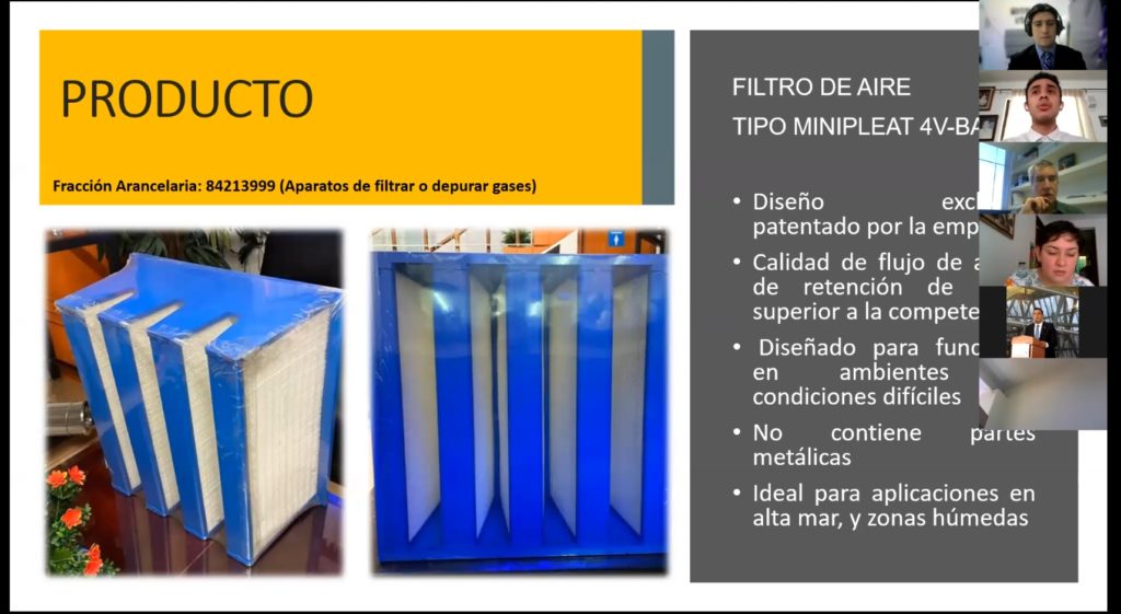 Los alumnos Gabriel Josué Cristiani Ramírez y Blanca Rubí Martínez Cabañas, realizaron la presentación de su Proyecto de Exportación «Filtro Industrial Minipleat 4v-bank a Lima Perú», ante los integrantes del jurado MF. Margarita Altamirano Vázquez, Mtro. Luis Manuel Cuevas Padilla y Dr. Daniel Antonio López Lunagómez