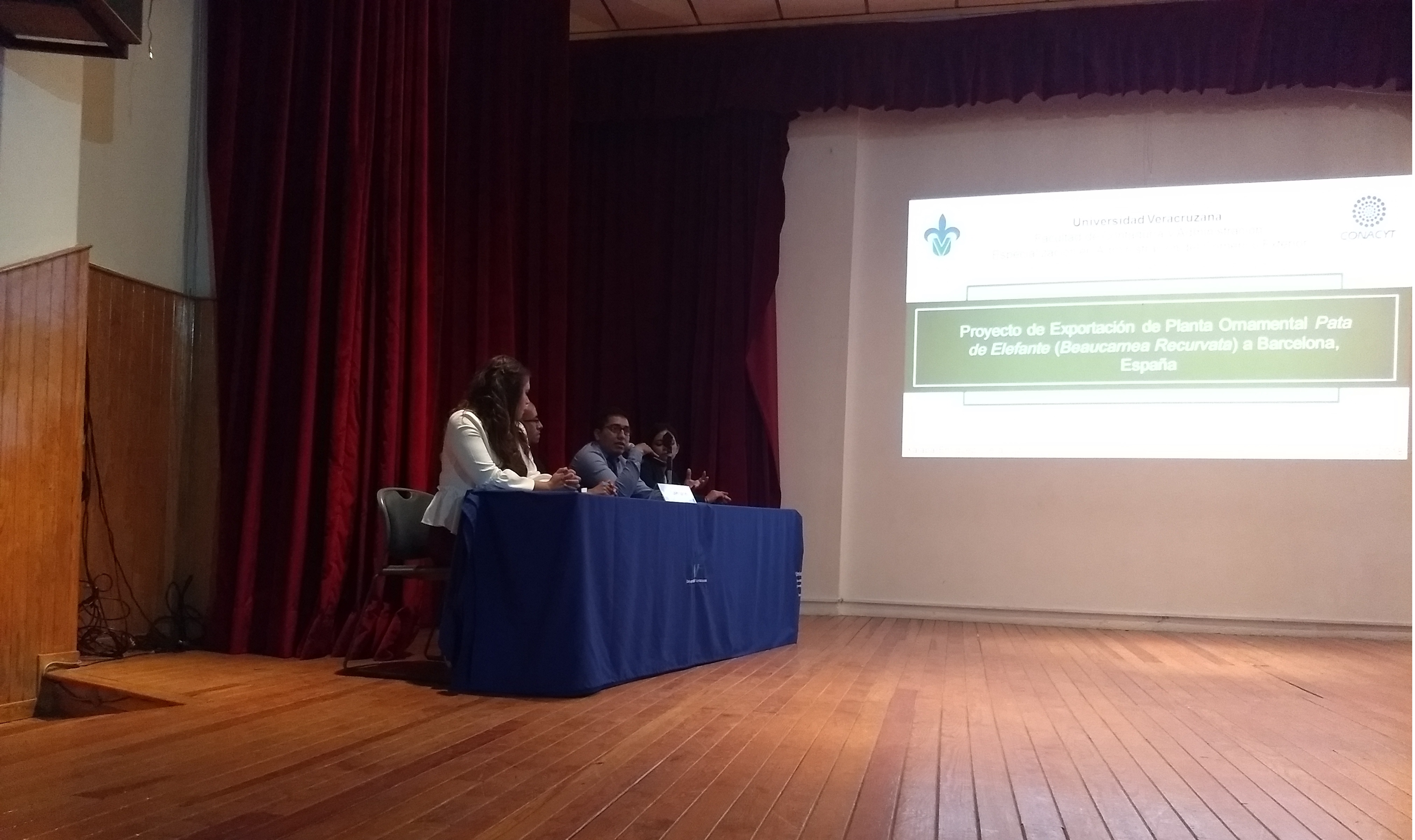 Los alumnos Aurora Monserrat Balderrabano García, Cosme Iván Carreto Vázquez, Ramón Ulises González Reyes y Zaira Paola Ruiz Lagunes, realizaron la presentación de su Proyecto de Exportación «Planta ornamental Pata de Elefante (Beaucarnea Recuruata) a Barcelona, España», ante los integrantes del jurado Mtra. Rosa Marina Madrid Paredones, Dr. Rogelio Ladrón de Guevara Cortés e Ing. Luis Manuel Cuevas Padilla.