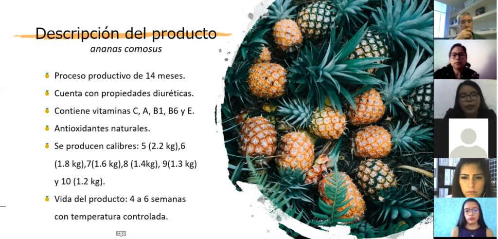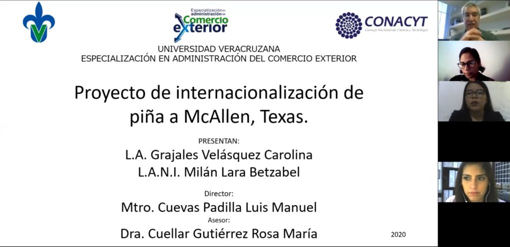 Las alumnas Carolina Grajales Velásquez y Betzabel Milán Lara realizaron la presentación de su Proyecto de Exportación «Proyecto de Internacionalización de piña a McAllen, Texas», ante los integrantes del jurado Dra. Rosa María Cuellar Gutierrez, Dra. Jessica Garizurieta Bernabe y Mtro. Luis Manuel Cuevas Padilla.
