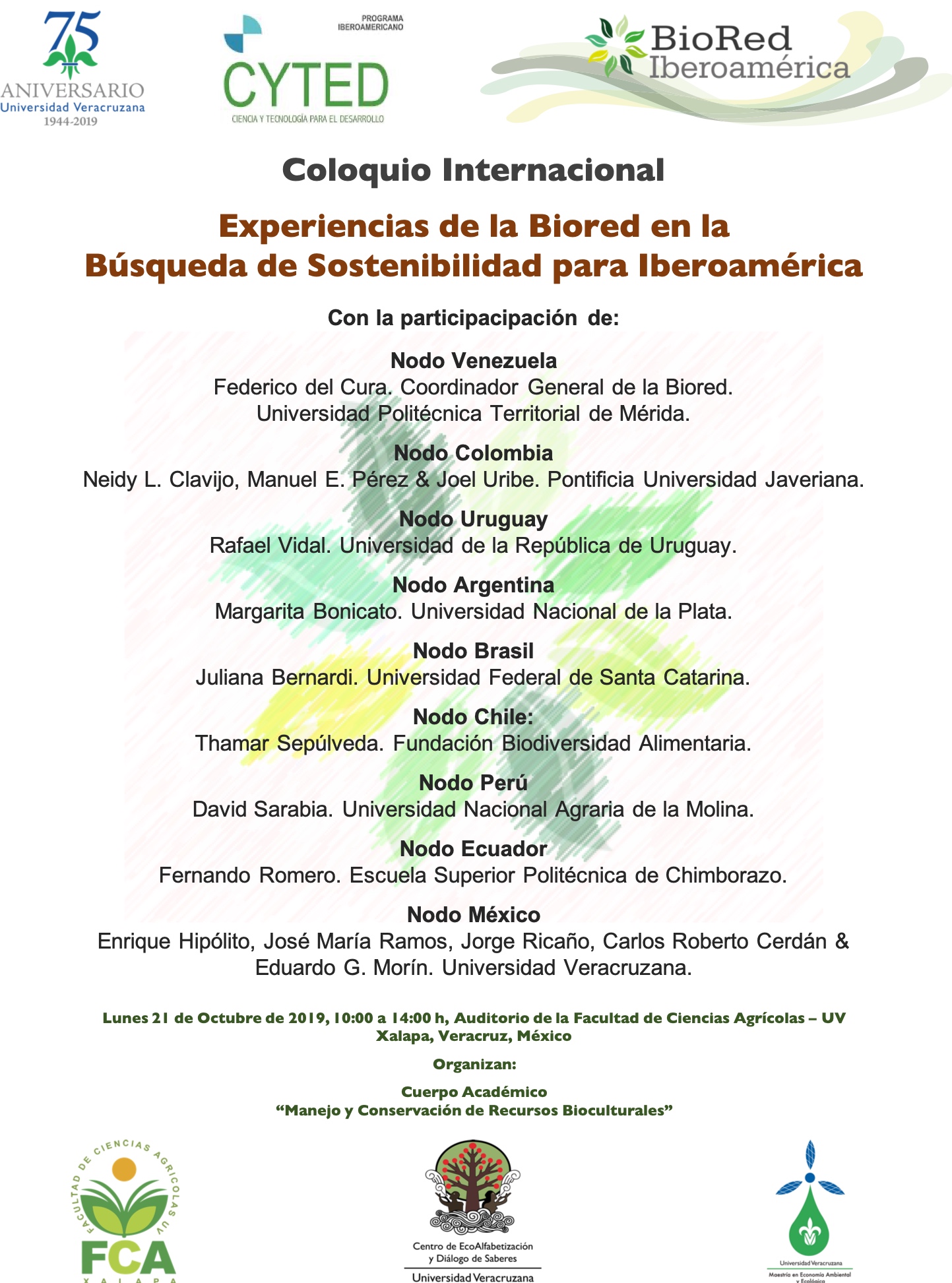 Este Coloquio se realiza en el marco de la Reunión a anual de la Biored Iberoamérica, que este año organiza el Centro de EcoAlfabetización y Diálogo de Saberes de nuestra Universidad, a través del Cuerpo Académico “Manejo y Conservación de Recursos Bioculturales”; en virtud de que sus integrantes son miembros de dicho consorcio de investigación.
