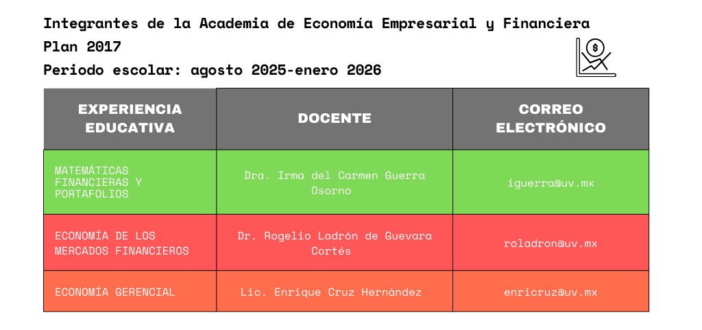 Economía Empresarial y Financiera Experiencias educativas que la integran: Economía Gerencial; Matemáticas Financieras y Portafolios; Economía de los Mercados Financieros. Coordinador: Dr. Rogelio Ladrón De Guevara Cortés – roladron@uv.mx Regresar