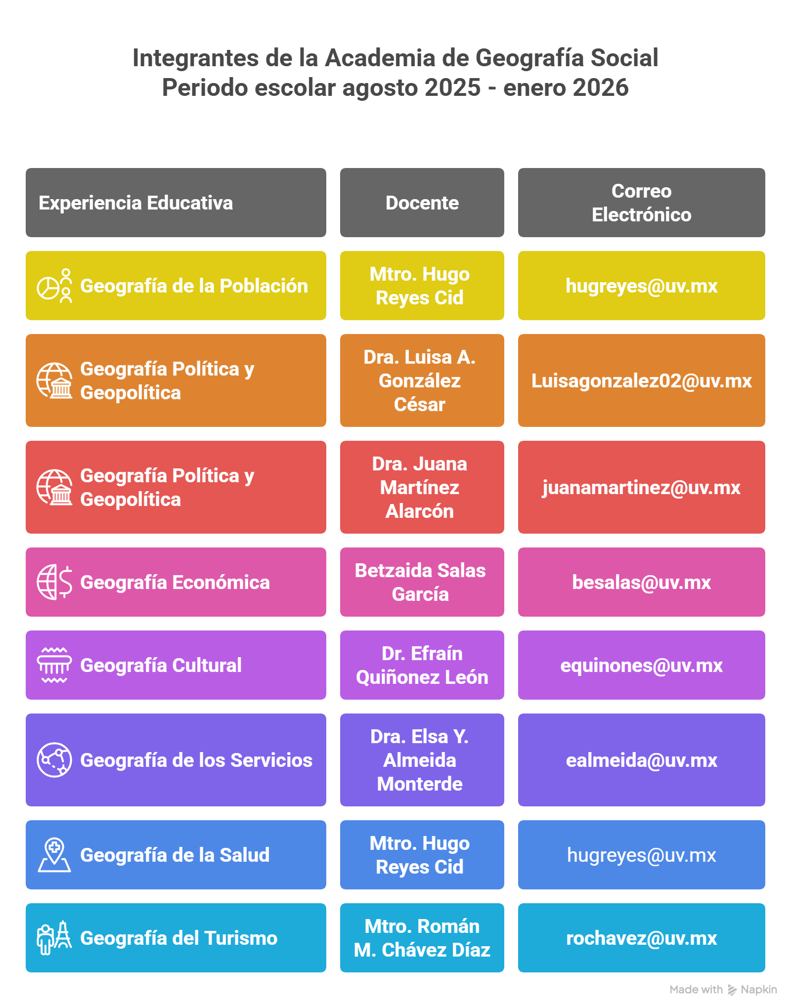 Geografía Social Experiencias educativas que las integran: Geografía de la Población Geografía Política y Geopolítica Geografía Económica Geografía Rural y Urbana Geografía Cultural Geografía Agraria Geografía de los Servicios Geografía de la Salud Género y Espacio Geografía Histórica Geografía del Turismo Coordinador: Dra. Luisa Angelina González César – luisagonzalez02@uv.mx Regresar