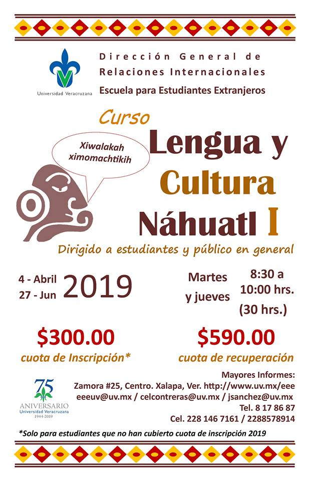 Dirección General de Relaciones internacionales Escuela para Estudiantes Extranjeros invitan Curso: Lengua y Cultura Náhuatl I Dirigido a estudiantes y publico en general Fecha, horario y Sede: