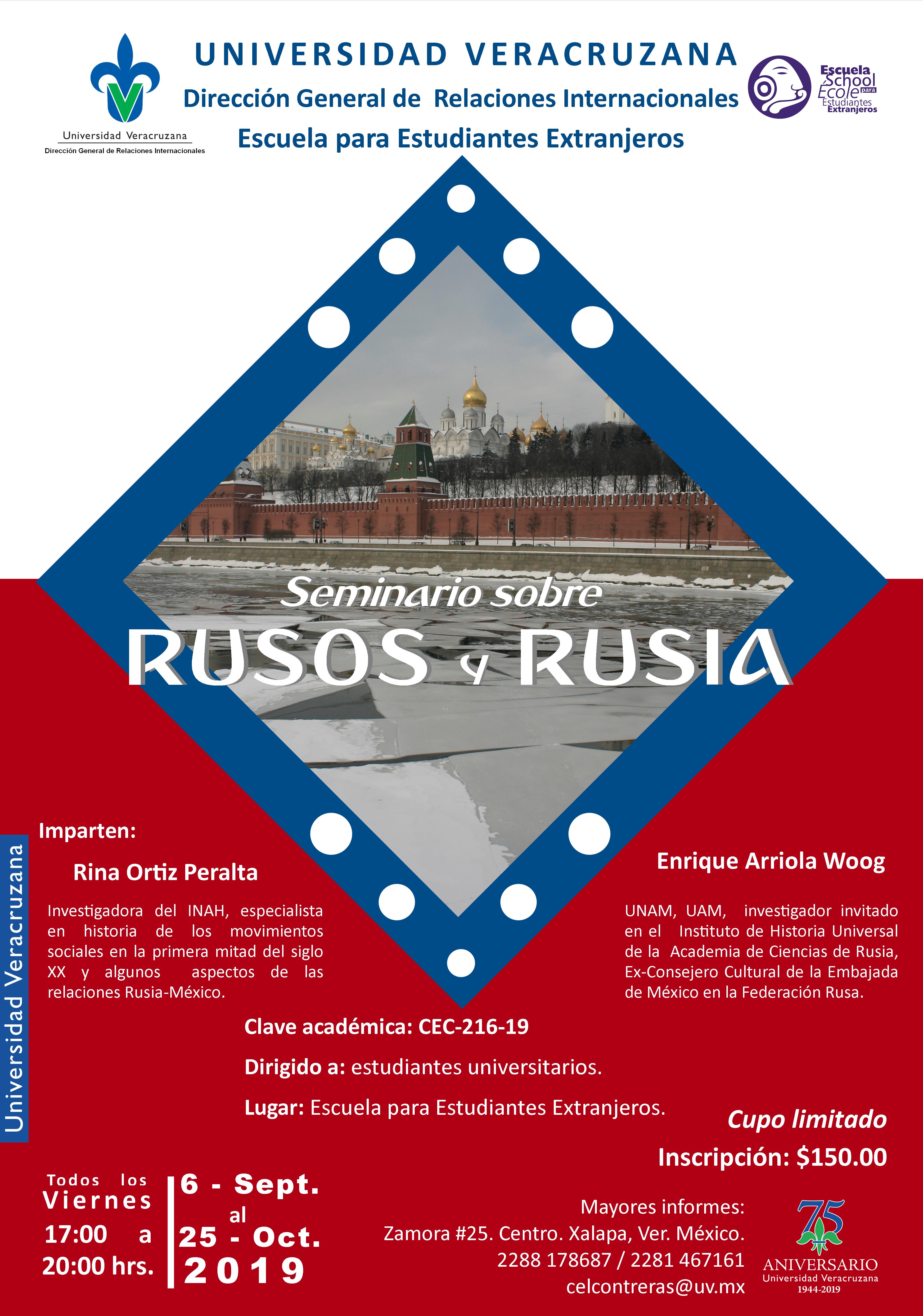 Rusos y Rusia Dirigido a: Estudiantes universitarios. Cupo limitado Fecha, horario, costos y sede: Escuela para Estudiantes Extranjeros, Zamora #25, Centro. Xalapa, Ver. Inscripciones abiertas Contacto: Telefono – (+52) (228) 8178687 – 102 |