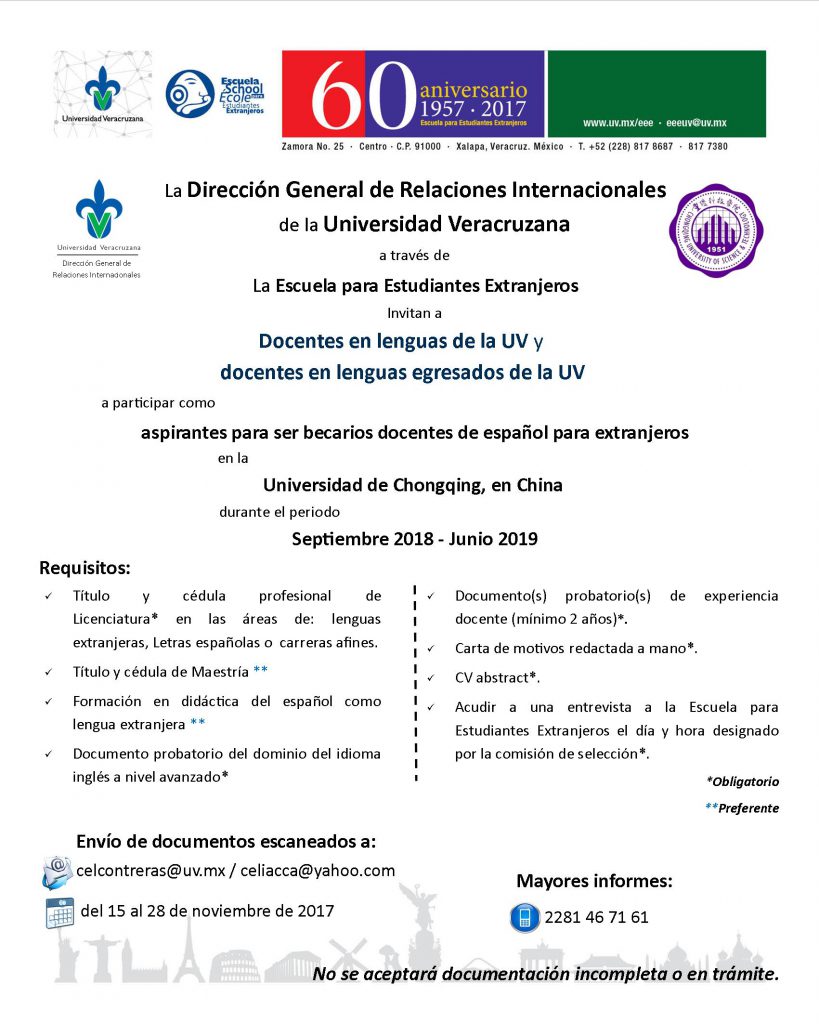 Aviso. En el marco del convenio de colaboración internacional entre la Universidad Veracruzana y la Universidad de Chongqing, la Escuela para Estudiantes Extranjeros de la Universidad Veracruzana, en Xalapa, Veracruz, invita a docentes en lenguas de la UV y docentes en lenguas egresados de la UV, a participar como aspirantes para ser becarios docentes de español para extranjeros en la Universidad de Chongqing, en China, durante el período Septiembre 2018-Junio 2019.