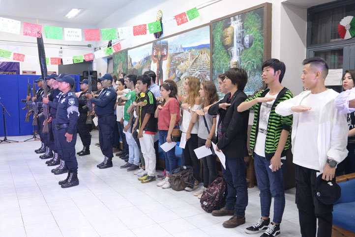 Minutos después, se rindieron honores a la bandera con el apoyo de la banda de guerra y la escolta de la Secretaría de Seguridad Pública del estado, dinámica que sorprendió a algunos de los asistentes: “Es la primera vez que asisto y presencio una celebración formal como ésta; vi la entrada que hicieron los guardias de la policía estatal y no pensé que fuera tan formal, no me lo imaginé así”, expresó Juan Sánchez, estudiante español.
