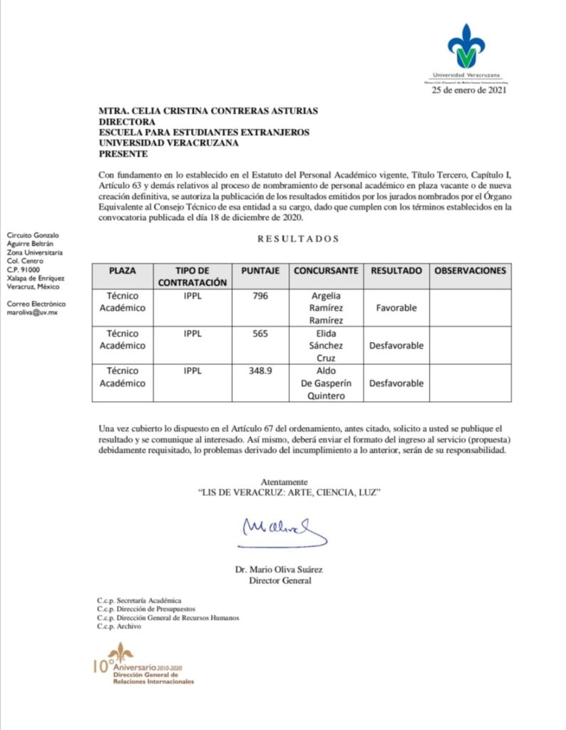 Tal como lo establece la convocatoria emitida el 18 de diciembre de 2020, damos a conocer los resultados del examen de oposición para ocupar la plaza vacante de Técnico Académico en la Escuela para Estudiantes Extranjeros.