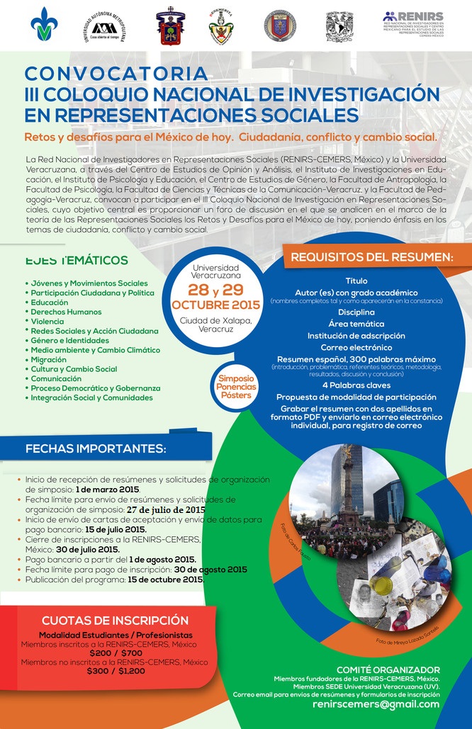La Red Nacional de Investigadores en Representaciones Sociales y el Centro Mexicano para el Estudios de las Representaciones Sociales: RENIRS-CEMERS, y la Universidad Veracruzana extienden la invitación para participar en el III ColoquioNacional de Investigación en Representaciones Sociales 2015, en la Ciudad de Xalapa. A celebrarse el día miércoles 28 y el jueves 29 de octubre de 2015, en las instalaciones de la USBI-Xalapa.