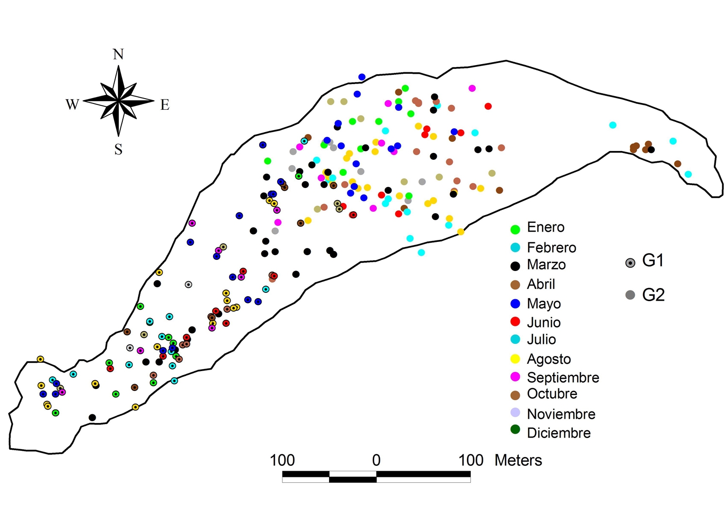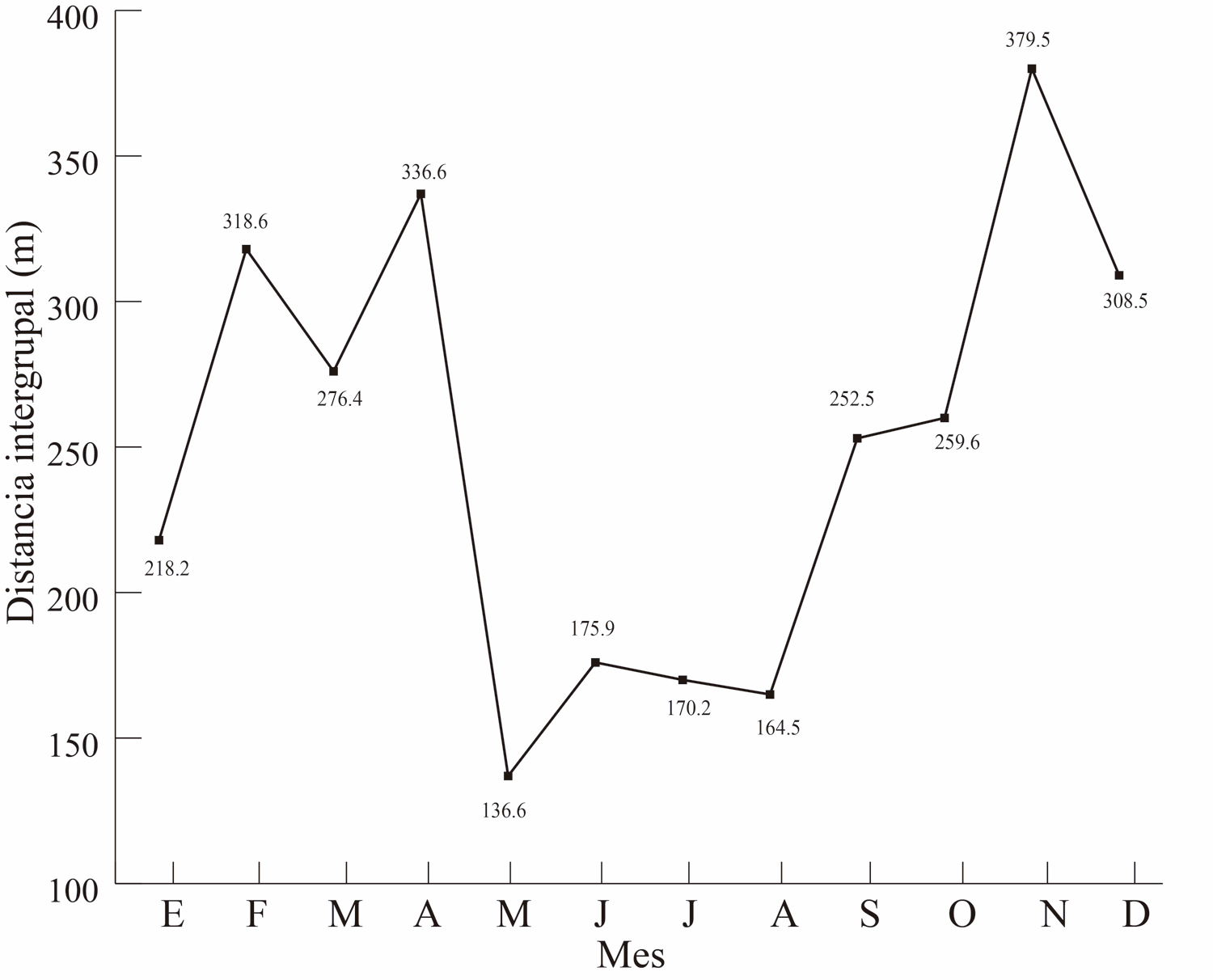 En la Figura 2, se ilustra la ubicación de ambos grupos durante los meses del año en el sitio de estudio. Mediante la distribución de sus ubicaciones, se determinó que la distancia entre los grupos fue de 288.7 ± 114.1 m. Además, los meses en donde hubo una menor distancia promedio fueron los meses de mayo a agosto con 161.8 ± 17.4 m, mientras que la mayor distancia intergrupal se registró en el mes de noviembre con 379.5 ± 79.2 m (Fig. 3).