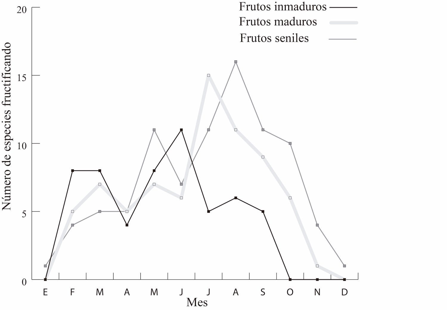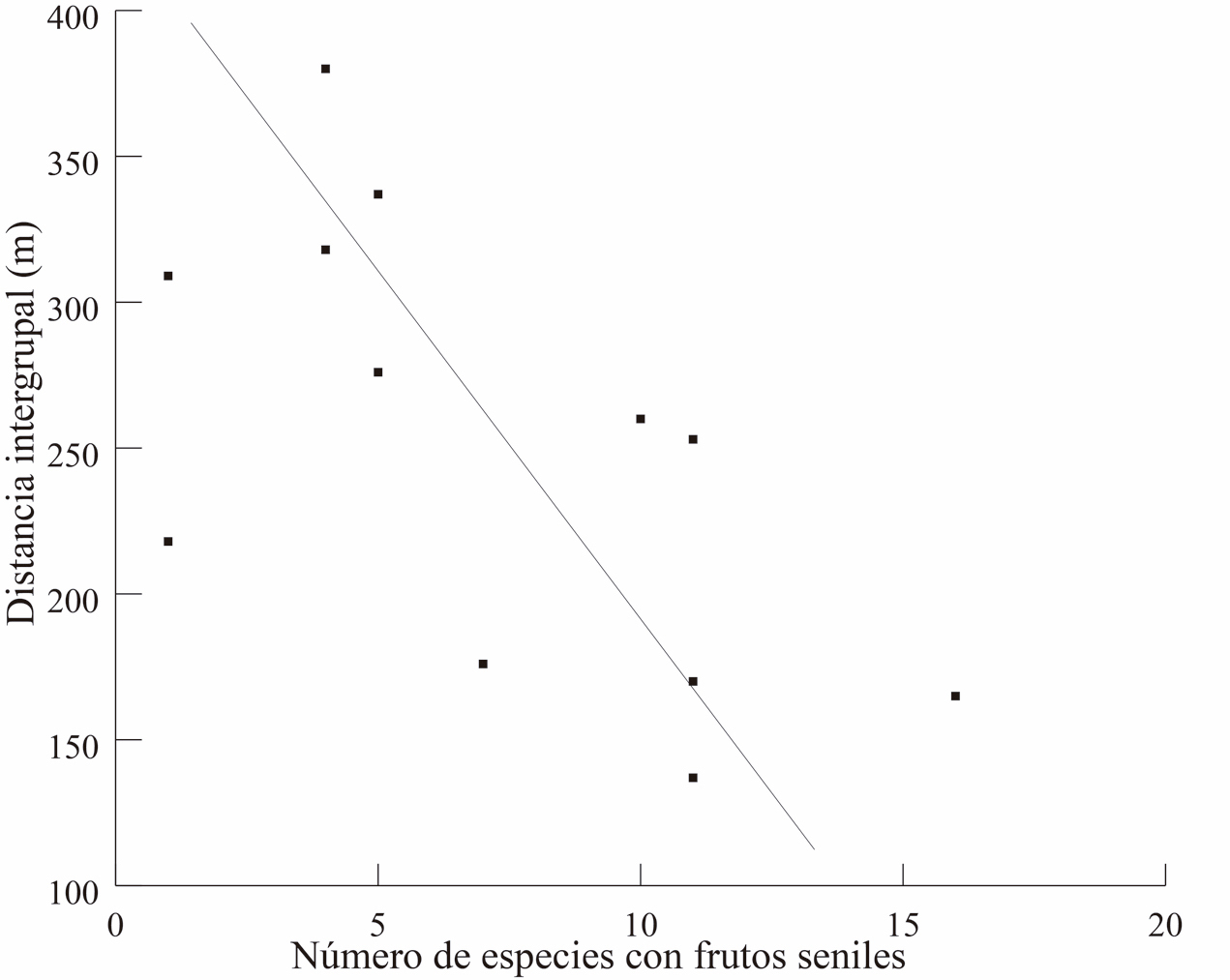 El número de especies al mes, con frutos inmaduros, maduros y seniles fue, 4.5 ± 3.8, 6.0 ± 4.4 y 7.1 ± 4.6, respectivamente. Asimismo, los meses en donde hubo un mayor número de especies con frutos inmaduros, maduros y seniles fueron junio, julio y agosto, respectivamente. En contraste, los meses con el menor número de especies fueron, de octubre a enero, con cero especies con frutos inmaduros; diciembre a enero, con cero especies con frutos maduros; y diciembre a enero con una sola especie con frutos seniles. Los meses en que la distancia promedio fue menor (mayo – agosto) coinciden con el periodo en donde comienza el declive en el número de especies con frutos inmaduros y en donde comienza el aumento en el número de especies con frutos maduros y seniles (Fig. 4). Por otra parte, el coeficiente de Spearman indica una correlación inversa entre la distancia intergrupal y el número de especies con frutos maduros (R= -0.63, P = 0.026) y la asociación con los frutos seniles (R= -0.68, P = 0.012). En el caso de frutos inmaduros, no hubo correlación (R = -0.40, P = 0.173, Fig. 5 a y b).