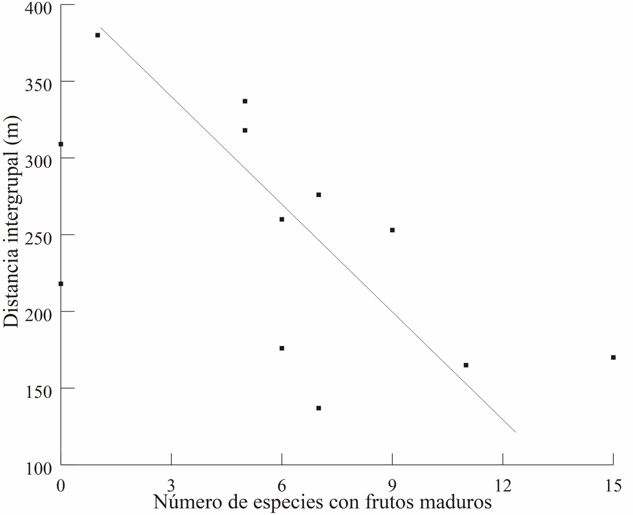 La asociación de la distancia intergrupal mensual y el número de especies alimenticias, con frutos y con la temperatura y precipitación promedio, fueron relacionadas con el coeficiente de correlación de Spearman. Se utilizó este coeficiente debido a que las pruebas de normalidad de Shapiro-Wilk señalaron una falta de normalidad en los datos. Los resultados de las pruebas estadísticas, así como las estadísticas descriptivas, se expresan en términos de media y desviación estándar (media ± D. E.). Los análisis espaciales y pruebas estadísticas se realizaron en los programas ArcView© v.3.235 y Statistica v 7.0.36