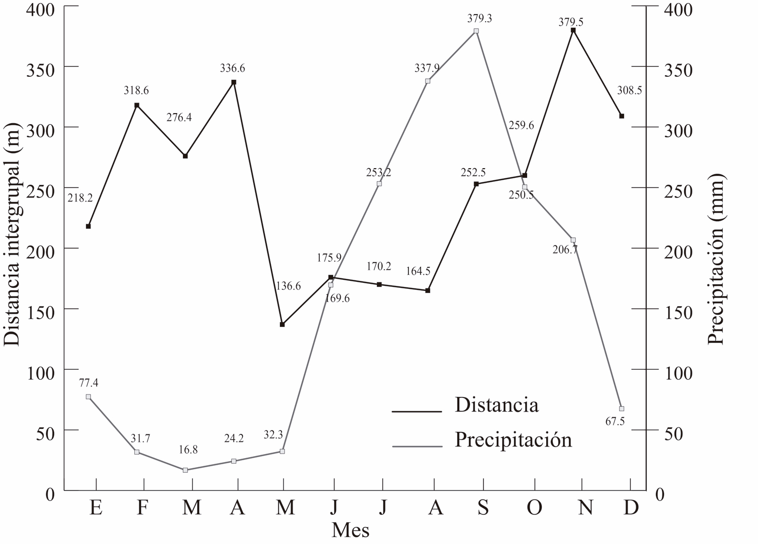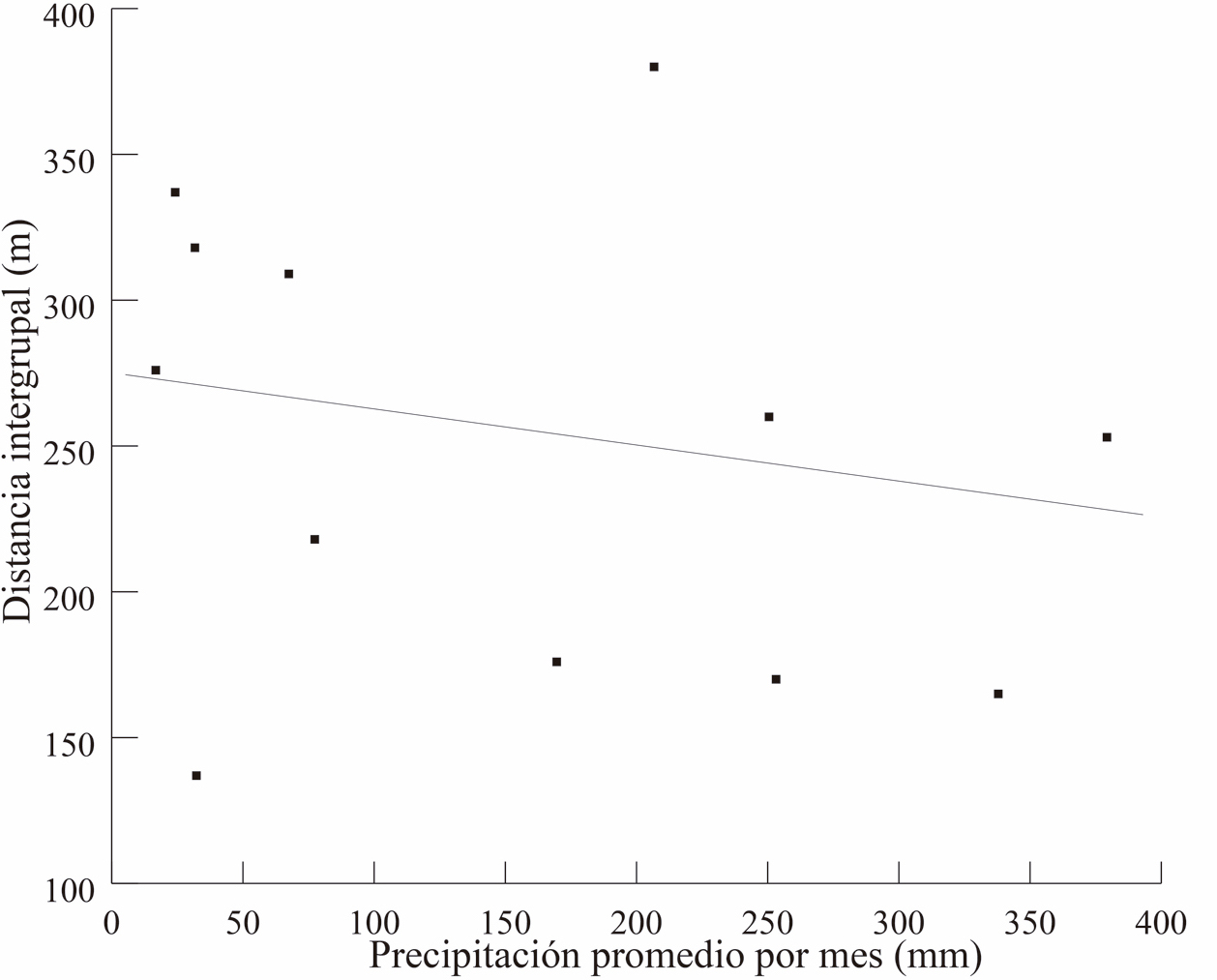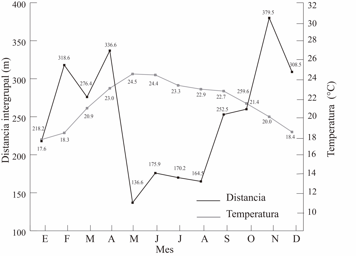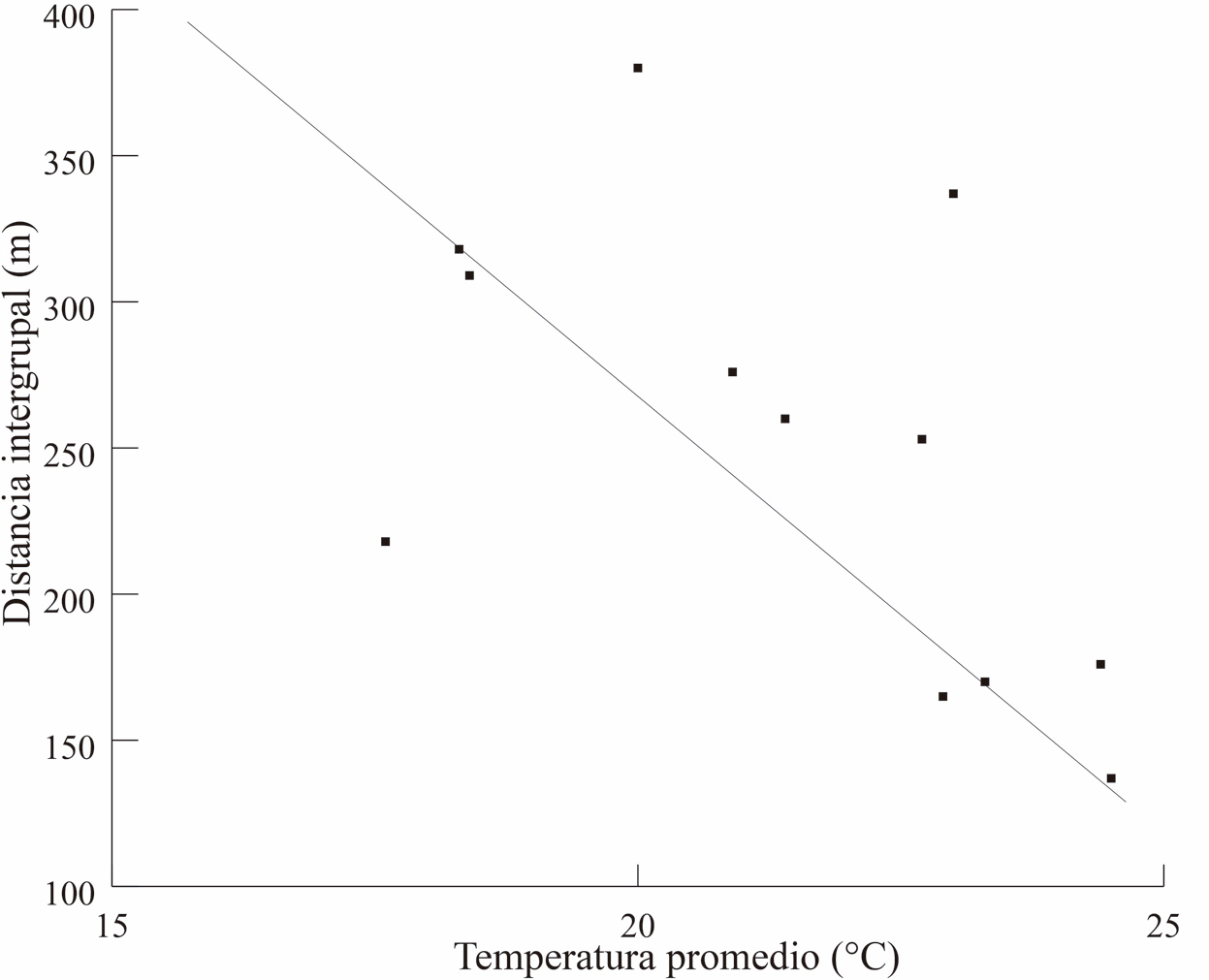 La variable climática con una mayor relación con la distancia intergrupal fue la temperatura. Esto implica que una temperatura ambiental baja, o el periodo del año en donde ocurren una temperatura más baja, se asocia con una mayor distancia entre los grupos. Por el contrario, un periodo, como la temporada seca, se asocia con un mayor acercamiento entre ellos.