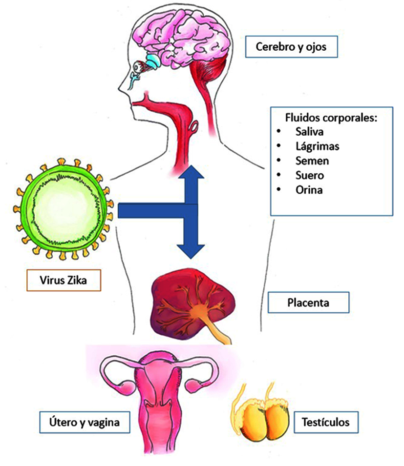 Figura 1. . Tropismo celular del virus Zika. Incide principalmente en células del ojo, útero, vagina y testículos. Atraviesa fácilmente al tejido encefálico y la placenta. Se encuentra incluso en diferentes fluidos corporales.
