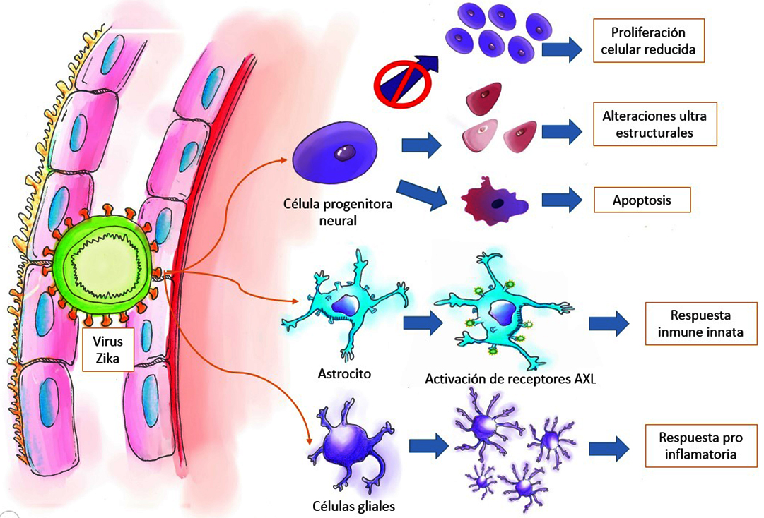 Diversos estudios han mostrado que el virus Zika puede infectar células madre neuronales en el cerebro en desarrollo, sin embargo, el encéfalo en etapa adulta también se ve afectado durante la infección transitoria.43 Durante la neurogénesis, los nichos neurogénicos están inmersos en el fluido cerebroespinal (CSF por sus siglas en inglés) para facilitar la comunicación celular a través de moléculas de señalización. Estos nichos contienen células progenitoras que se dividen para producir neuronas o glía, dependiendo de señales intrínsecas y ambientales, y se encuentran altamente vascularizados, haciéndolos vulnerables a las infecciones virales.44 En la microglía infectada por virus Zika circulante, se induce una respuesta de tipo pro-inflamatoria similar a la encontrada en tejidos infectados por dicho virus (Fig. 2). Así mismo, se ha demostrado que la interacción con las células madre neuronales (CMN), aumenta el riesgo de propagar más fácilmente el virus.45 Por otra parte, las CMN en el cerebro fetal parecen ser especialmente impactadas por la infección de virus Zika, con una gran susceptibilidad a la infección viral o a la citotoxicidad inducida por el virus.35 Sin embargo, existen pocos estudios enfocados en conocer el mecanismo exacto por el cual el virus Zika infecta a los tejidos neurales.