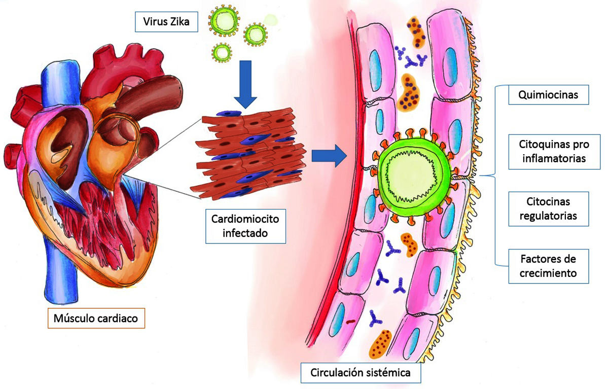 Figura 3. Proceso inmunopatológico por infección con virus Zika en el tejido cardiaco. Se observa daño indirecto al músculo cardiaco con elevación sérica de quimiocinas, citosinas regulatorias y pro-inflamatorias, así como de factores de crecimiento..