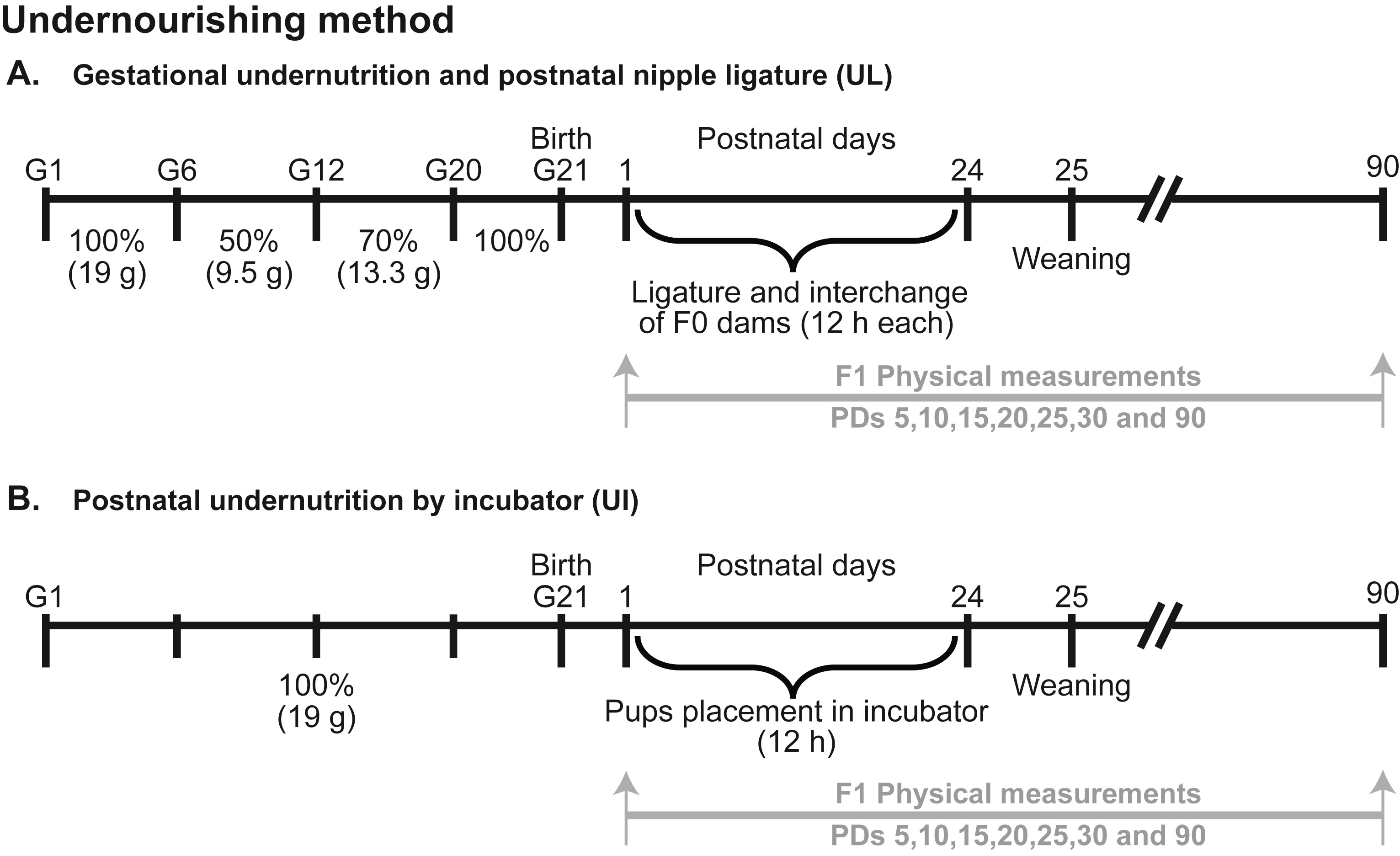 Figure 1. Experimental design for A. Gestational undernutrition and postnatal nipple ligature (UL); B. Postnatal undernutrition by partly separating half of the litter into an incubator (UI).
