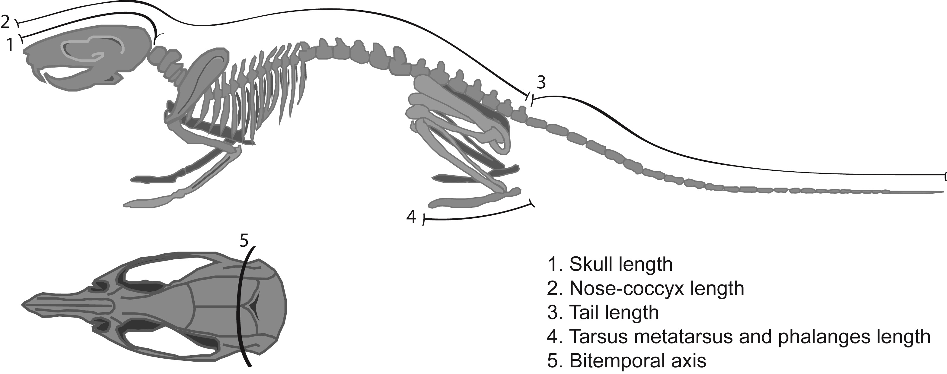 Body lengths. Measurement of all body lengths of the animals was done with a special plastic anatomic tape (0.5 cm width) used for body composition analysis. The physical development measurements included skull length, from the anterior border of the foramen magnum to the tip of the nasal bones,35 nose-coccyx length, from the foramen magnum to the first coccygeal vertebrae; tail length, all coccygeal vertebrae; tarsus-metatarsus and phalange length, the length summation of these three components; bitemporal axis, measured from the external ear canal (left to right) following the interaural line (Figure 2); size (length), the sum of the nose-coccyx length and tail length; BMI, weight (g) by body length squared (cm2).